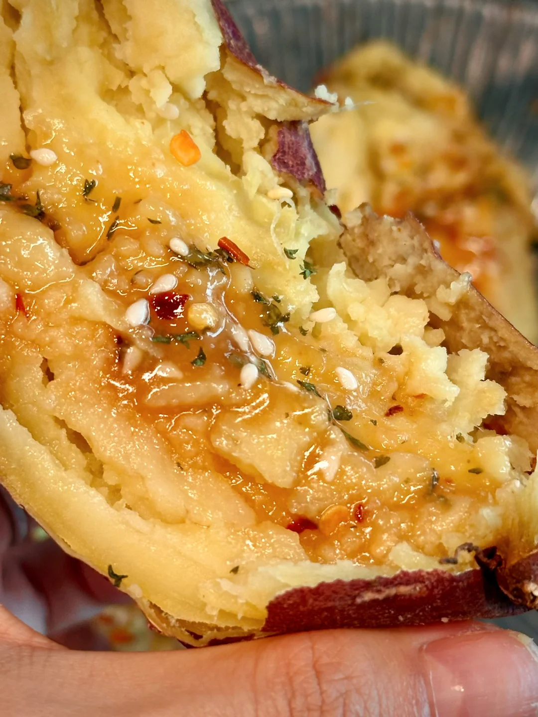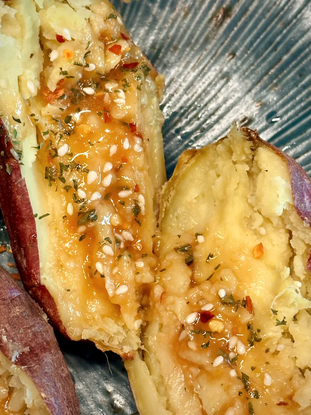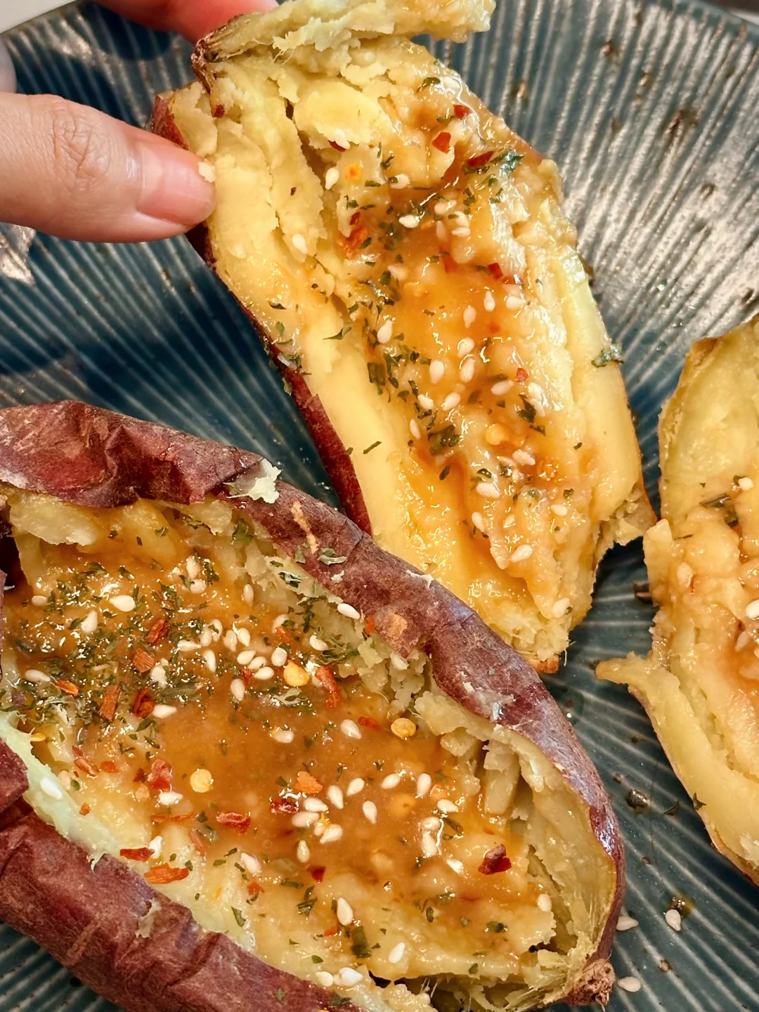 红薯趁热掰开,叉子捣一下增加表面积,均匀地在上面抹酱料,再撒上白芝麻、欧芹和小葱碎,就可以吃啦!