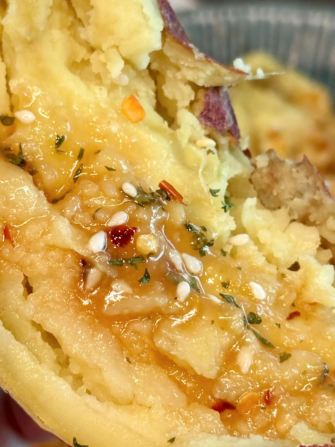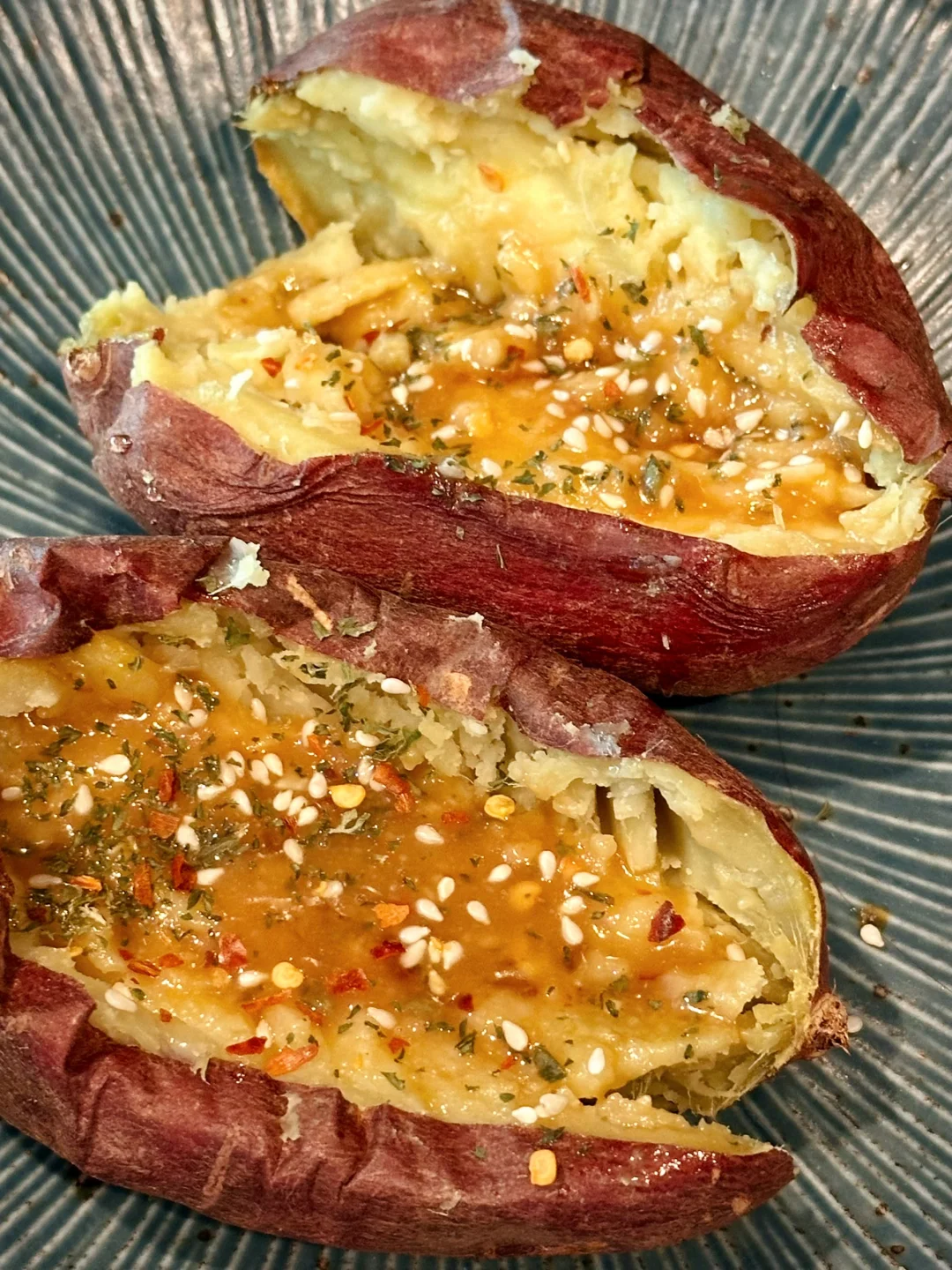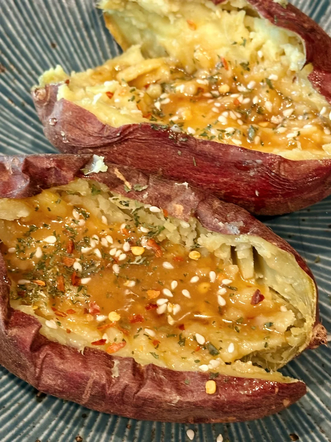 红薯趁热掰开,叉子捣一下增加表面积,均匀地在上面抹酱料,再撒上白芝麻、欧芹和小葱碎,就可以吃啦!