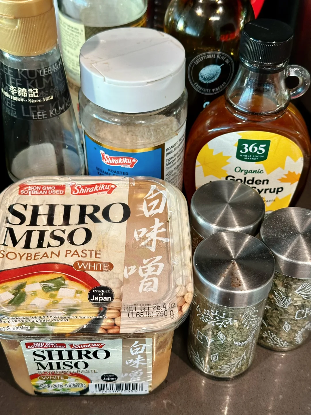 酱料:黄油1tbsp,味噌半tbsp,花生酱1tbsp,枫糖浆半tbsp,果醋1/2tbsp,芝麻油一点点,辣椒粉chili flake