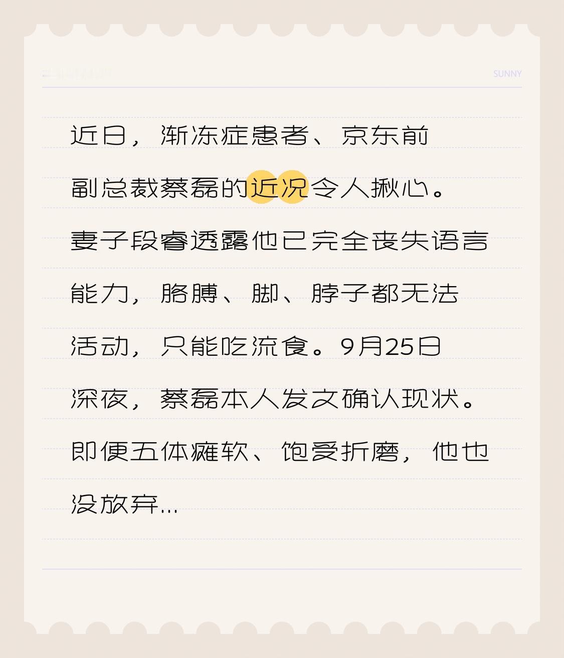 近日,渐冻症患者、京东前副总裁蔡磊的近况令人揪心。妻子段睿透露他已完全丧失语言能力,胳膊、脚、脖子都无法活动,只能吃流食。9月25日深夜,蔡磊本人发文确认现状。 即便五体瘫软、饱受折磨,他也没放弃。每天通过眼控带领团队处理科研、运营等大量工作,过去20个月对外科研资助超5000万,背后是上百个科研项目合作。虽工作强度不如从前,但思维依旧敏捷。“宁可与渐冻症战死,不会面对绝症屈辱等死”,蔡磊用行动诠释着与病魔战斗的决心,希望奇迹能继续发生!