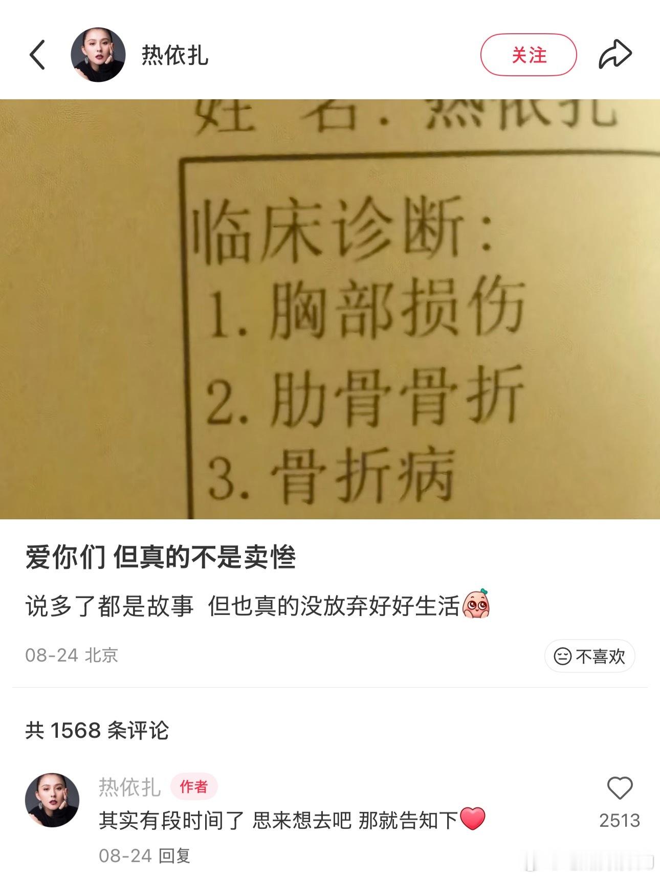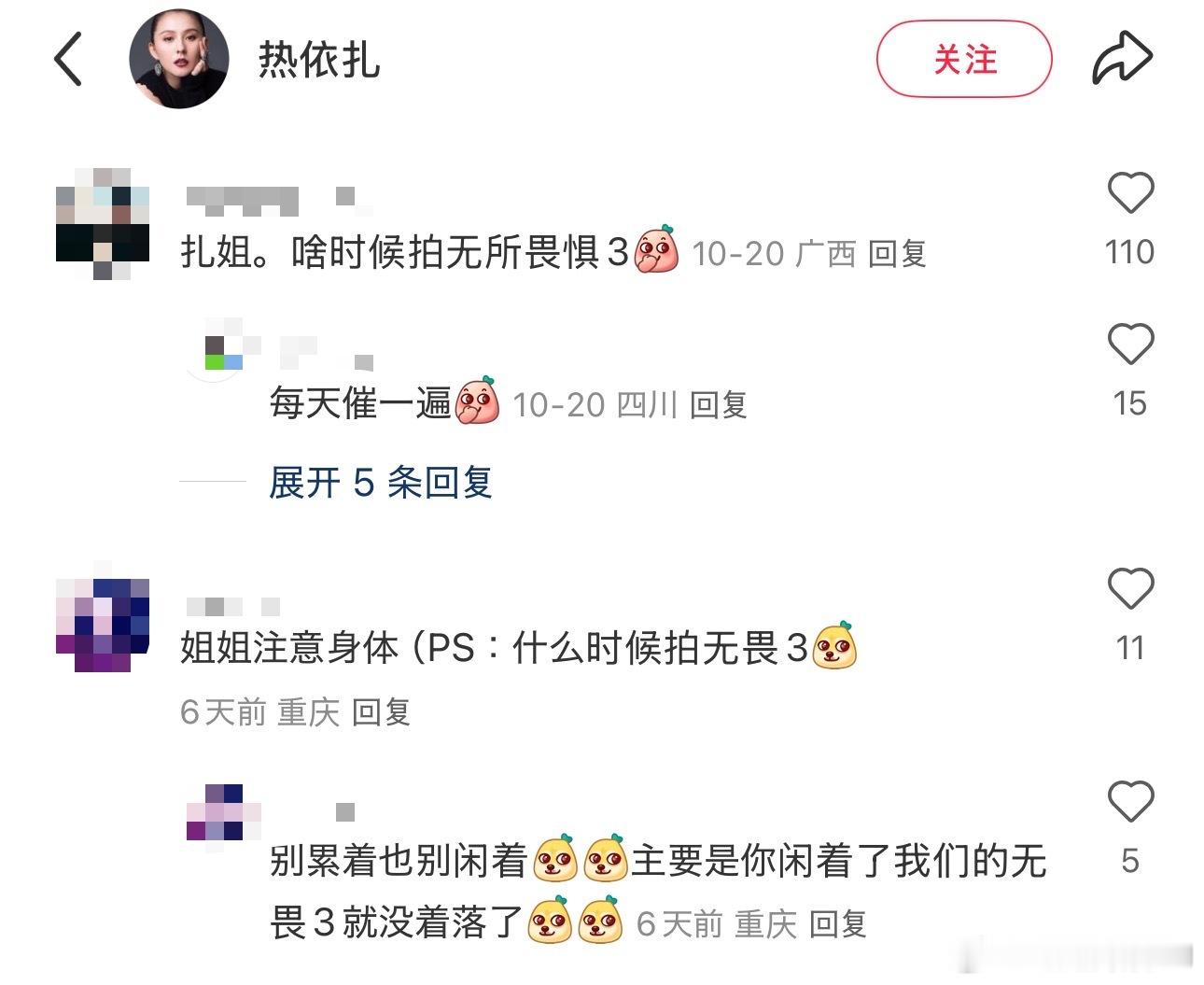 她8月就晒过病历,确实身体出了很严重的问题。但之后更新了好几条内容,评论区都是催进组问《无所畏惧3》什么时候拍的,所以热依扎特意回应了一下。从措辞和评论区回复来看,不拍和平台方或者剧方决策无关,是热依扎自己现阶段要先回归现实生活去处理各种问题。期待她一切都好。