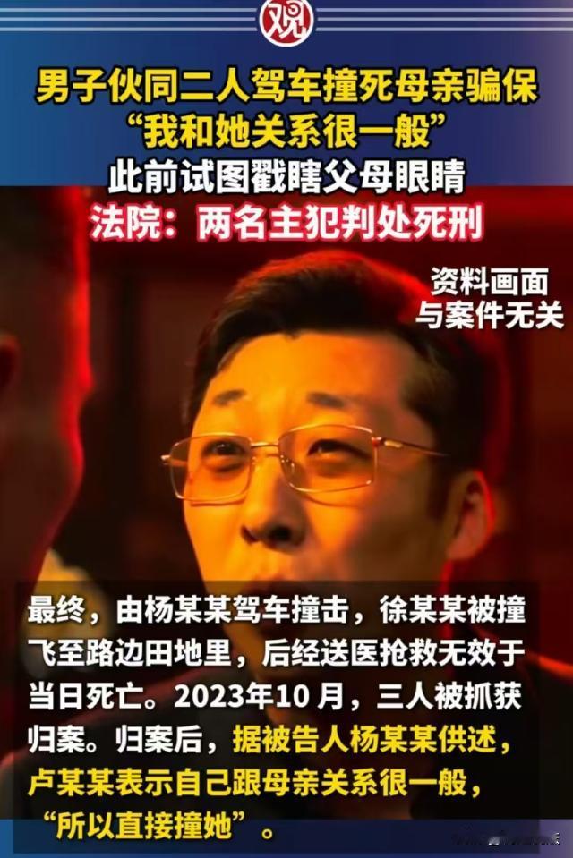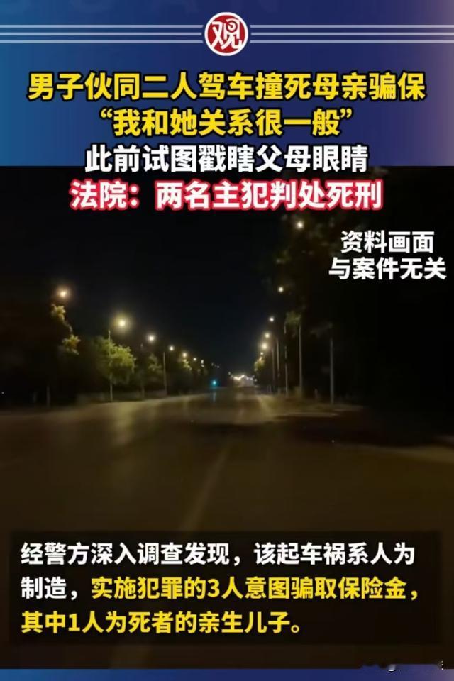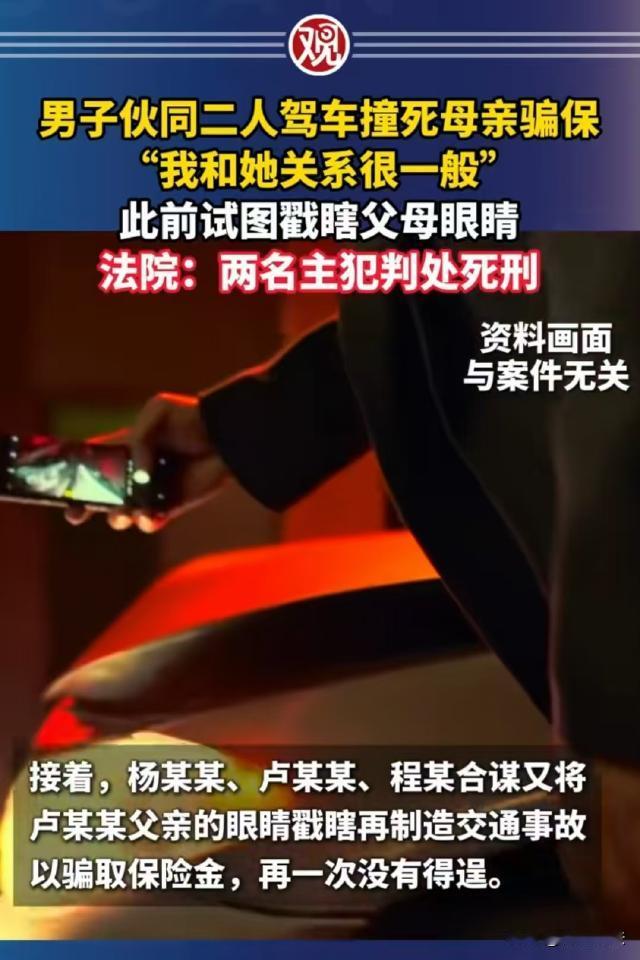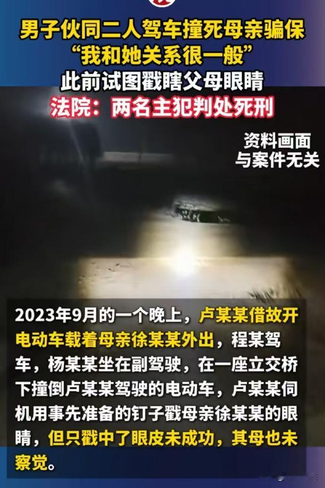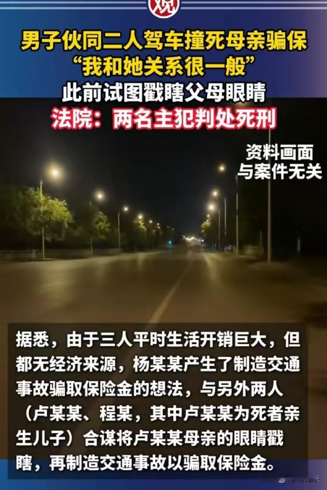 浙江台州,女子徐某某外出时被一辆越野车撞飞,并于当天救治无效离世,可民警调查后发现,撞徐某某的是她儿子的好友,交通事故是徐某某儿子策划的,为的就是骗取保险金吃喝挥霍! 据红星新闻、观察者网等报道,二零二三年九月,台州市椒江区某村的村道上发生了一起严重的交通事故,44岁的徐某某被一辆越野车撞飞到旁边的田里。 案发后,涉案人员立即报了警,民警到场后展开勘察,可随着调查的深入,民警却发现这起事故存在多处蹊跷之处。 据了解,案发当天,被害者徐某某的儿子卢某将徐某某叫到了村道边,徐某某刚到路边没多久,就被车子撞飞。 撞飞徐某某的人,就是卢某的好哥们杨某和程某。这三人平时形影不离,并且都没有正经工作,每天吃喝玩乐,欠下一屁股债。 民警立即进行深入调查,很快确认这是一起杀人骗保案,主谋就是死者徐某某的亲生儿子卢某。 据卢某说,他和杨某及程某是初中同学,后来三人成了好哥们。 因为一直没有正经工作,三人平时只能朝家里要钱,家里要不来就借网贷,几人都是欠下了一屁股债。 二三年4月,卢某的母亲,即受害人徐某某出了交通事故,获赔近34万。 卢某将这件事告诉了杨某和杨某程某,杨某是他们三人中的主心骨,得知徐某某获赔这么大一笔钱,杨某就让卢某把徐某某的卡偷出来,把钱取出来花。 赔偿金到账后,卢某偷出徐某某的身份证和卡,偷偷将钱转走了。 三人拿到钱后,不想着还账,反而挖空心思想着怎么吃喝玩乐,没多久,30多万就被他们挥霍一空。 通过这件事,杨某想出了通过人为制造交通事故骗取保险赔偿金的主意,三人觉得这可比找家里要钱和上班来钱快多了。 于是,三人商量后,于二三年9月的一个晚上实施了第一次作案。 卢某借故骑电瓶将徐某某从家里骗了出来,在一座立交桥下故意被杨某的车撞倒,随后,卢某掏出随身携带的铁钉扎徐某某的眼睛。 卢某原本计划将徐某某一只眼睛扎瞎,可当时只扎到了徐某某的眼皮,徐某某也没有察觉。 这次失败后,卢某又和父亲商议,将他的眼睛戳瞎骗保。 卢某父亲最开始不同意,后来又同意了,可卢某和杨某划过他的眼睛后,他的眼睛没有大碍,第二次作案依旧以失败告终。 不死心的三人决定,这次直接将徐某某撞死,于是卢某再次将徐某某骗到他们事先踩好点的地方,制造了这起交通事故。 据卢某的父亲说,事发前几天,杨某、程某和他儿子卢某在他家商量,要把妻子撞死,他不同意,可三人不停的说,他生气之下就说了一句:随你们便! 几天后,三人第三次作案成功。 那么,三人的行为应该如何认定?他们将受到什么处罚。 1、杨某和卢某构成盗窃罪。 《刑法》第二百六十四条规定,盗窃公私财物,数额较大的,或者多次盗窃、入户盗窃、携带凶器盗窃、扒窃的,处三年以下有期徒刑、拘役或者管制,并处或者单处罚金;数额巨大或者有其他严重情节的,处三年以上十年以下有期徒刑,并处罚金;数额特别巨大或者有其他特别严重情节的,处十年以上有期徒刑或者无期徒刑,并处罚金或者没收财产。 杨某教唆卢某偷取母亲的身份证和卡,并将交通事故赔偿金转走挥霍,卢某实施了具体的盗窃行为,二人构成盗窃罪的共犯。 2、三人构成故意杀人罪。 故意杀人罪是指故意非法剥夺他人生命的行为。 《刑法》第二百三十二条规定,故意杀人的,处死刑、无期徒刑或者十年以上有期徒刑;情节较轻的,处三年以上十年以下有期徒刑。 杨某作为三人团伙的主心骨,提出制造事故骗保的主意,并积极组织策划,主导了整个犯罪过程。 卢某作为徐某某的儿子,不仅配合杨某的计划,还亲自实施了用铁钉扎母亲眼睛等伤害行为,最终将母亲骗至预定地点导致其被撞身亡。 二人主观上具有明确的非法剥夺他人生命的故意,客观上实施了导致徐某某死亡的行为,严重符合故意杀人罪的构成要件。 程某虽未直接实施关键的伤害和撞击行为,但他明知犯罪计划仍参与其中,为犯罪行为提供了一定的支持和帮助,同样构成故意杀人罪。 在共同犯罪中,杨某和卢某起到了主要作用,应认定为主犯。 杨某作为犯罪的提议者和组织者,策划了整个犯罪过程,指挥卢某实施具体犯罪行为;卢某作为主谋,积极参与并实施了关键犯罪行为,直接导致了母亲的死亡和盗窃行为的发生。 依据《刑法》规定,主犯应承担较重的刑事责任。 程某在犯罪过程中起次要或者辅助作用,应认定为从犯。 根据《刑法》第二十七条规定,对于从犯,应当从轻、减轻处罚或者免除处罚。 程某虽然参与了犯罪商议和部分行动,但相较于杨某和卢某,其在犯罪中的地位和作用较小,应从轻处罚。 最终,杨某和卢某因故意杀人罪和盗窃罪被判处死刑,决定执行死刑。同时,并处杨某某罚金8万元,卢某6万元。 程某犯故意杀人罪,判有期徒刑7年。 责令杨某和程某退赔被害人徐某某家属312300元。