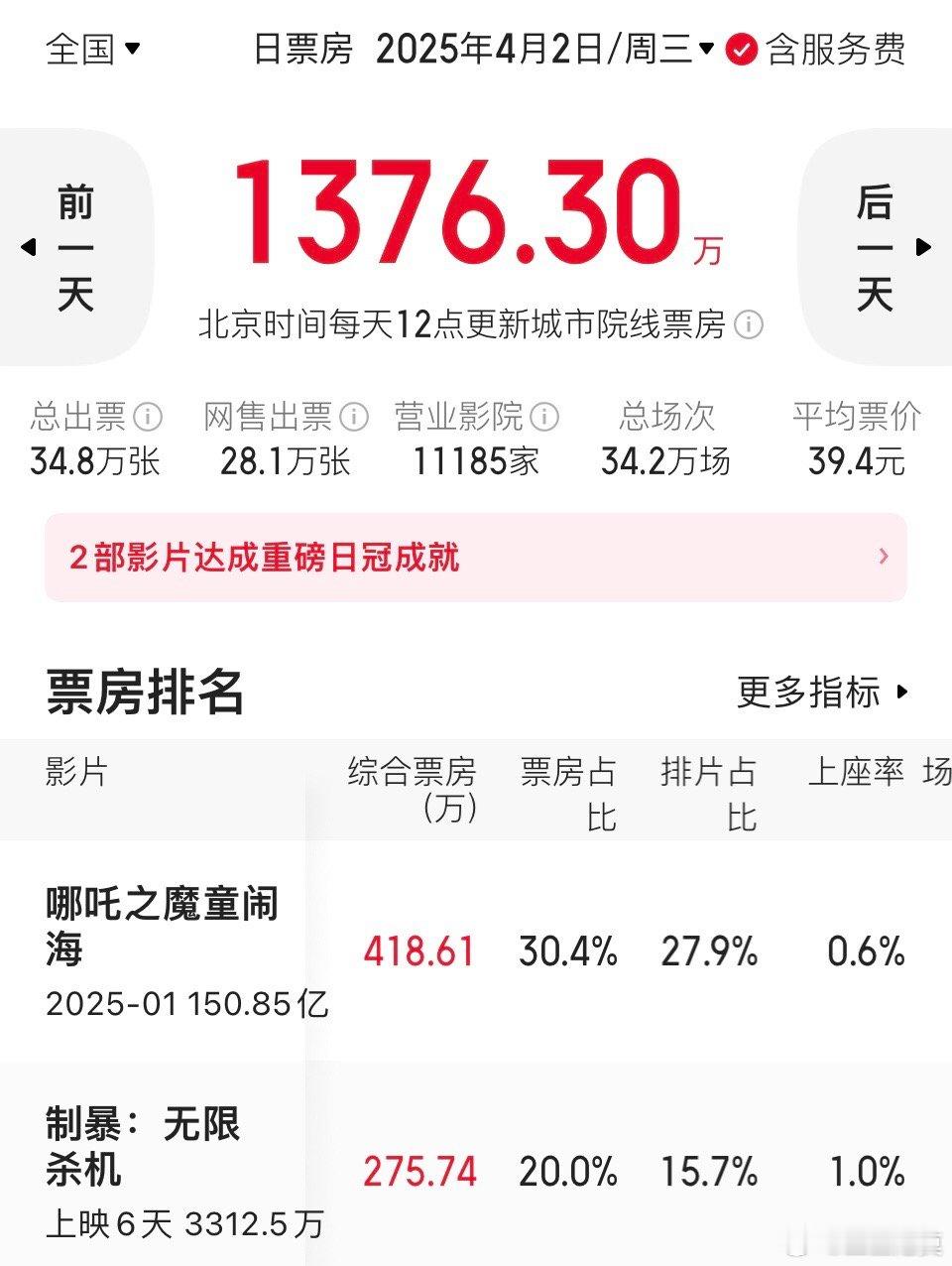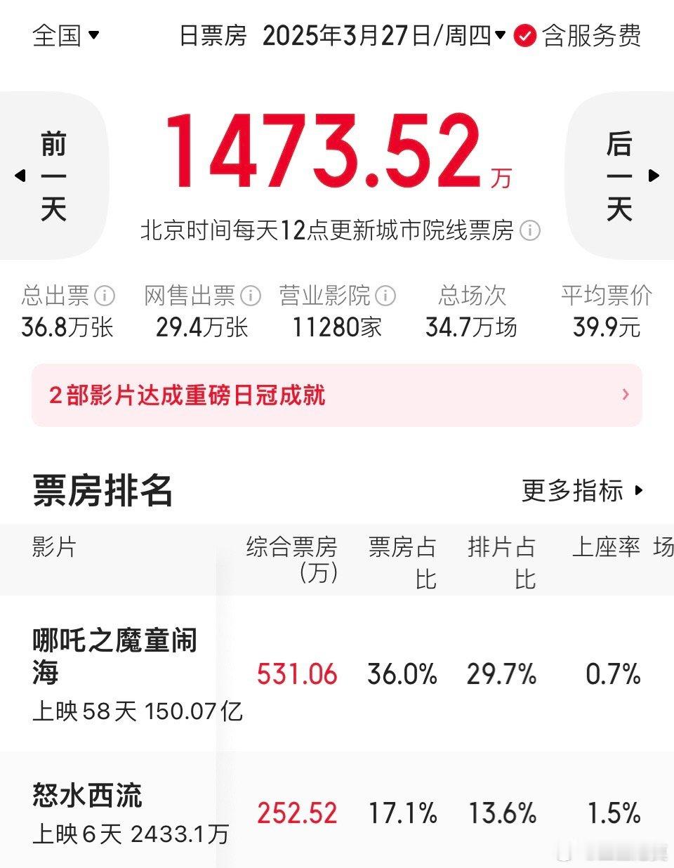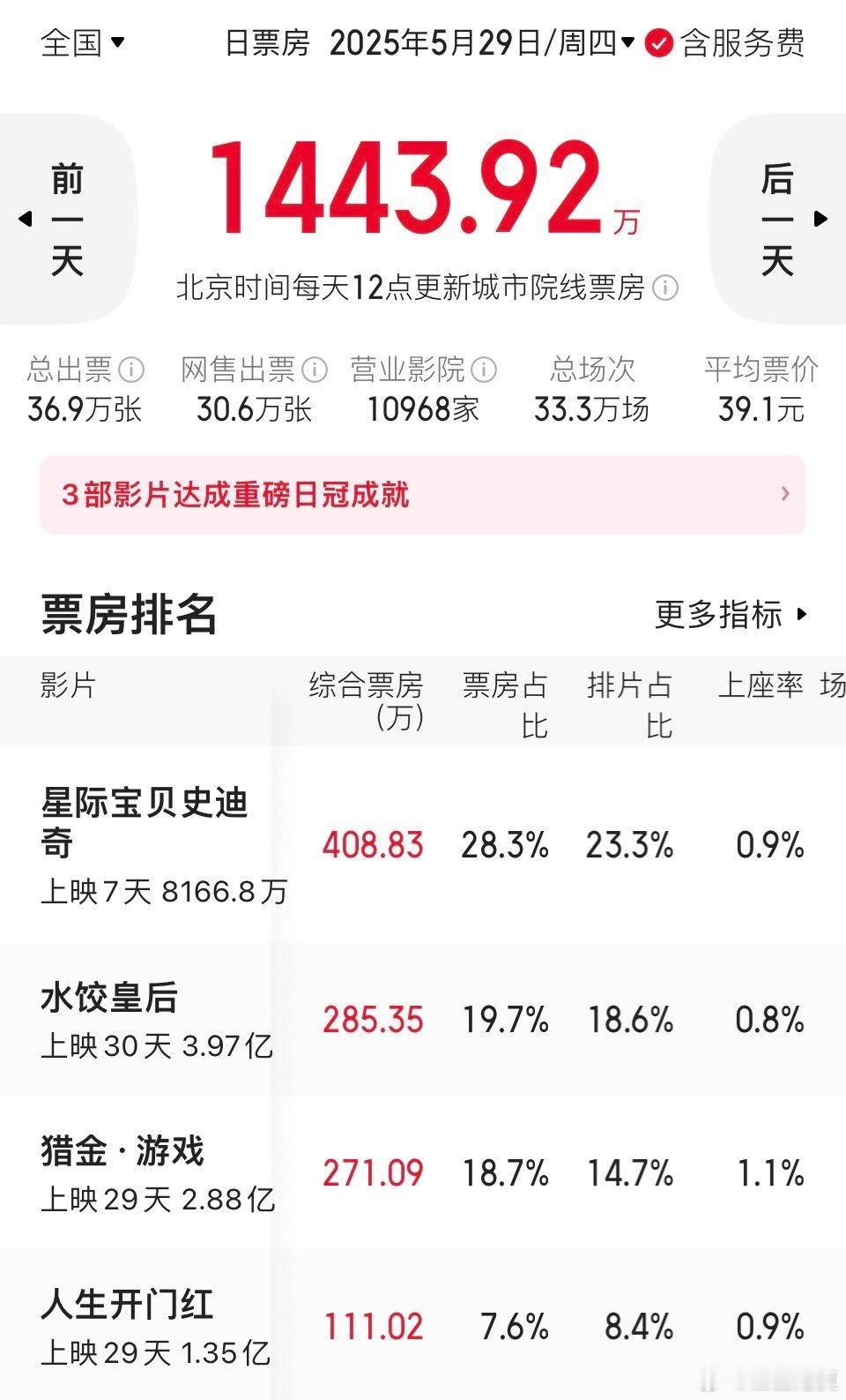今天上座率、票房占比、单日票房领先的还是《浪浪人生》,依旧大满贯。