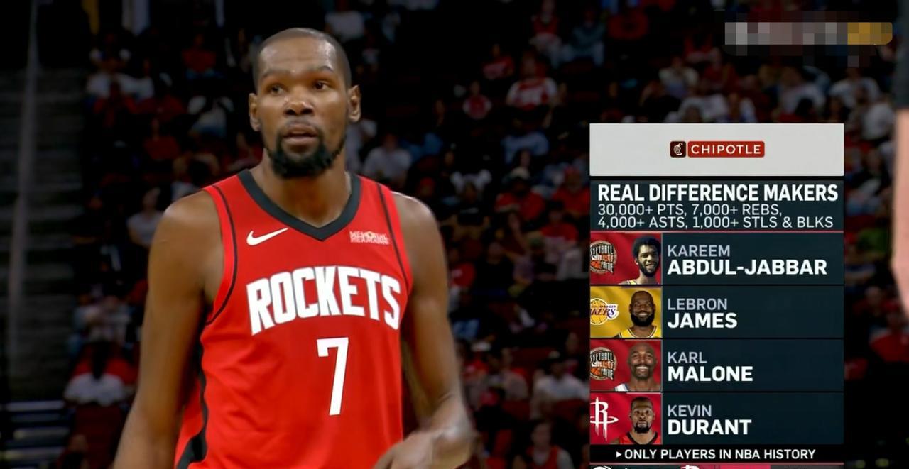 火箭超级巨星杜兰特真是太伟大了!在今天火箭主场迎战篮网的比赛中,当时比赛进行到了第一节的五分多钟,当杜兰特执行罚球的时候,转播方给出了一组数据,数据显示,截止到目前,NBA历史上一共四名球员得分30000+、篮板7000+、助攻4000+、抢断和盖帽1000+,而杜兰特就位居其中,其余三名球员分别是贾巴尔、卡尔-马龙和詹姆斯。 由此可见,杜兰特是多么的伟大,他绝对是NBA历史上排名前十的球员。
