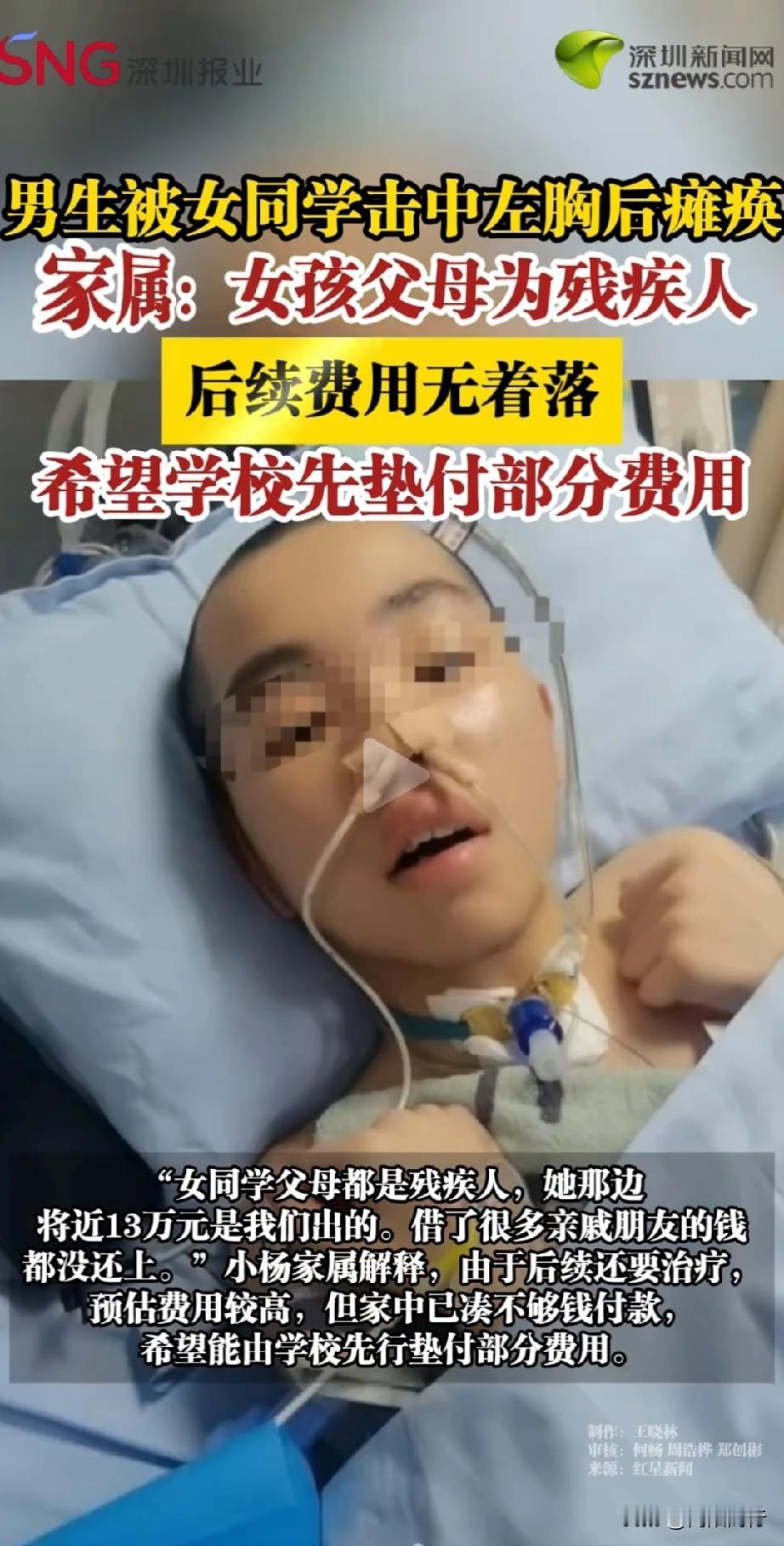 一句玩笑拳打左胸,14岁男孩突然瘫痪!谁该买单? 就因为喊了女同学一声“大力女侠”,14岁的小杨被一拳打在左胸,直接瘫倒在地,再也站不起来了。 俩孩子平时就爱打闹,可这无心的一拳,毁了一个少年的未来。更让人揪心的是,女孩父母都是残疾人,家里拿不出后续治疗费,小杨一家彻底陷入绝境。 校园打闹不是小事,玩笑得有分寸,安全永远是底线。没有谁想酿成悲剧,但意外发生了,责任不能缺位,关爱更不能缺席。 我觉得不管是学校、家长,都得重视孩子的安全教育和边界感培养。你们觉得这事儿该怎么解决?谁该承担主要责任?