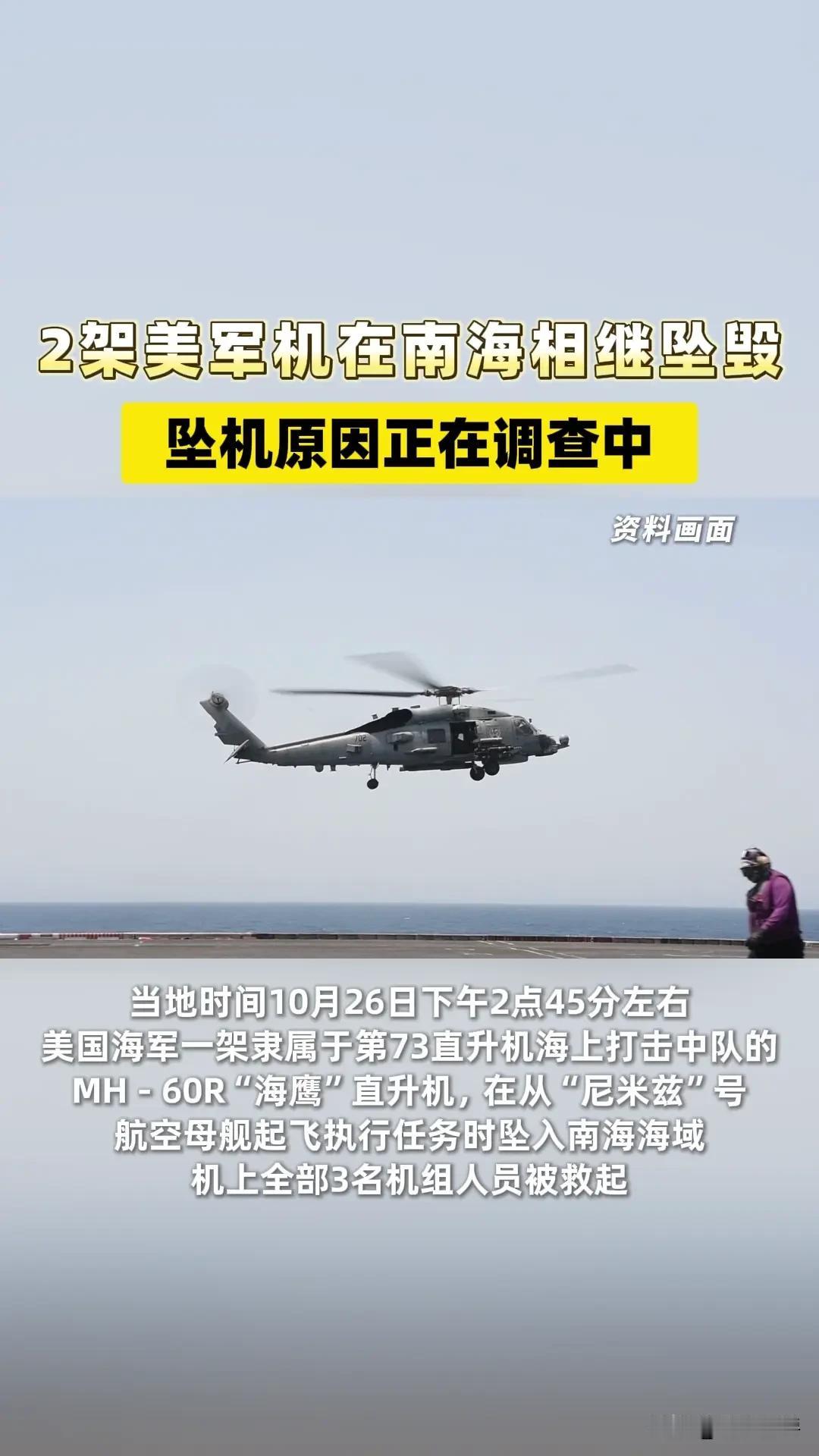 美帝真的衰退了。 10月26日,美国海军“尼米兹”号航母上两架战斗机一头栽进南海。而且还是最拿得出手的飞机——一架MH-60R“海鹰”直升机、一架“超级大黄蜂”,前后不过30分钟,前后脚掉进海里。 中美在马来西亚谈判呢,美国航母又来南海,想给东南亚国家展示:看我们的世界第一海军地位依旧,跟着我们走,没错! 结果两架军机坠海,把帝国的威武一起埋进南海。 据说正在调查原因,原因无非是气候,操作失误等。要说南海气候不好,潮湿,那我们的战机在南海就正常飞行。如果操作失误,那这个失误率美军也太拉垮了。 只能说明一个问题,美国衰退了,新的航母和战机造不出,都是老掉牙的航母在强行支撑,没人打他就往海里掉,如果用于作战,结果可想而知。 南海,将是美军的噩梦。
