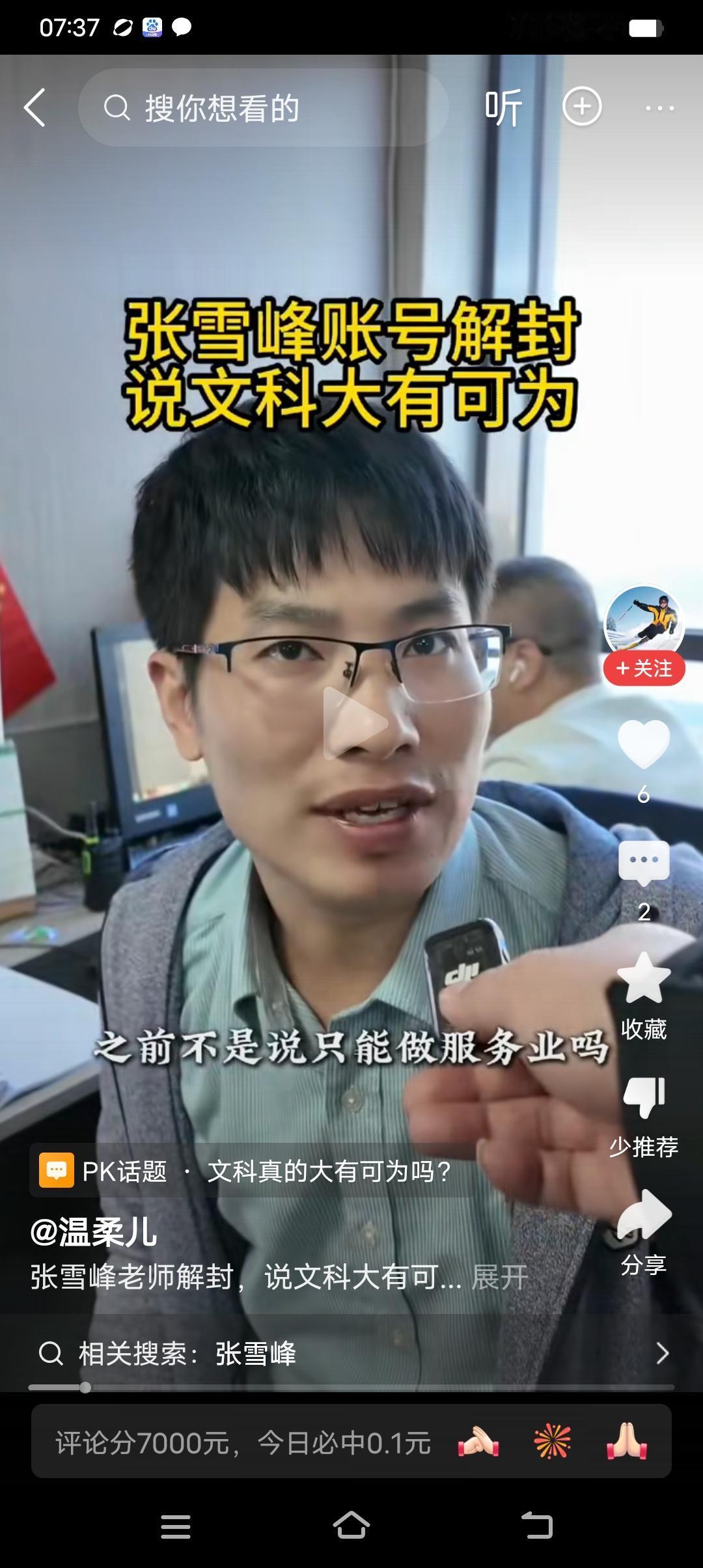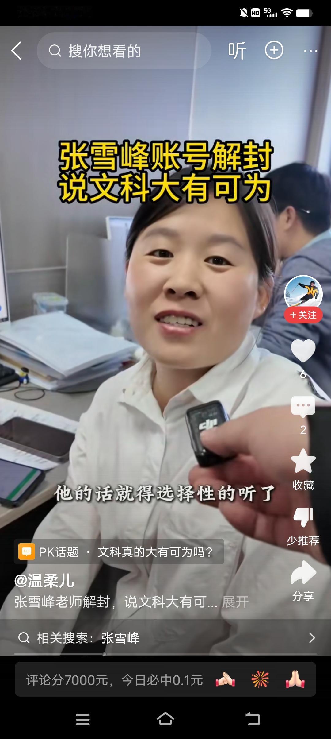 网友评论张雪峰老师: 一、现在知道文科的厉害了吧? 二、他的话要选择性的听。 三、之前不是说文科只能做服务业吗? 四、复出后,眼神都清澈了。 五、解封后说文科大有可为。 欢迎大家留言文明交流!