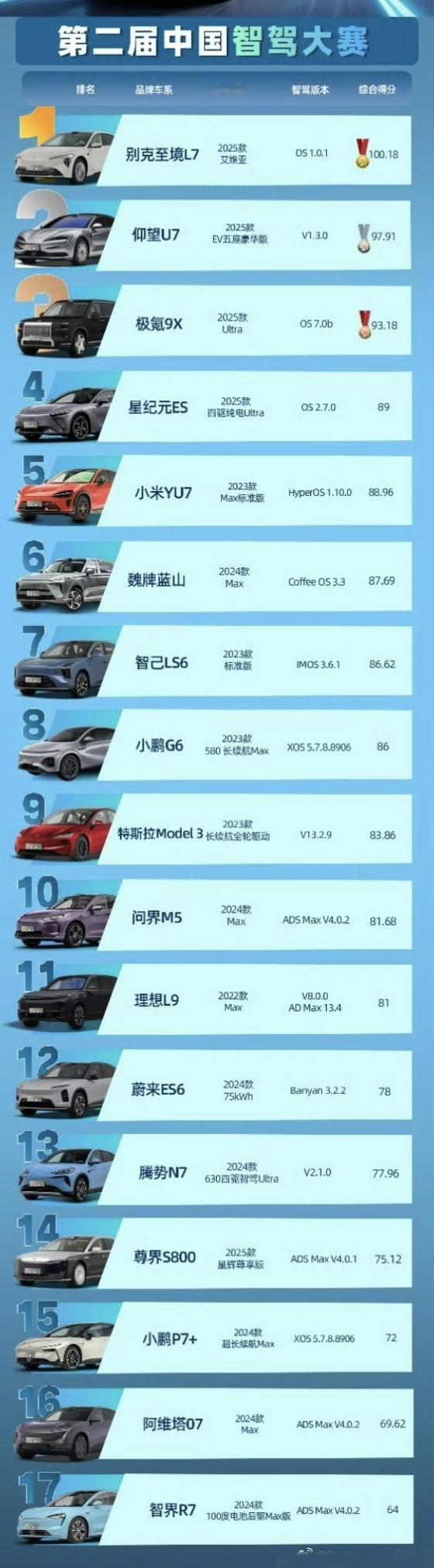 智驾大赛宁波站,供应商方案大逆袭! 冠军是搭载momenta R6飞轮大模型的别克至境L7。这是别克至境L7的首次参赛,也是mmt R6飞轮大模型的首次参赛,首次就是冠军🏆。 别克至境L7的智驾能力行业妥妥的第一梯队。 今年以来,momenta的智驾水平已经快步追赶上来了。 恭喜@飞走的云520 完整排名: 1,别克至境L7 momenta方案 2,仰望U7 momenta方案 3,极氪9X 浩瀚智驾 4,星纪元ES 博世方案 5,小米YU7 自研 6,魏牌蓝山 自研 7,智己LS6 momenta方案 8,小鹏G6 自研NGP 9,Model3 自研 FSD 10,问界M5 华为ADS 11,理想L9 自研AD 12,蔚来ES6 自研NOA 13,腾势N7 momenta方案 14,尊界S800 华为ADS 15,小鹏P7+ 自研NGP 16,阿维塔07 华为ADS 17,智界R7 华为ADS【来自懂车帝车友圈】