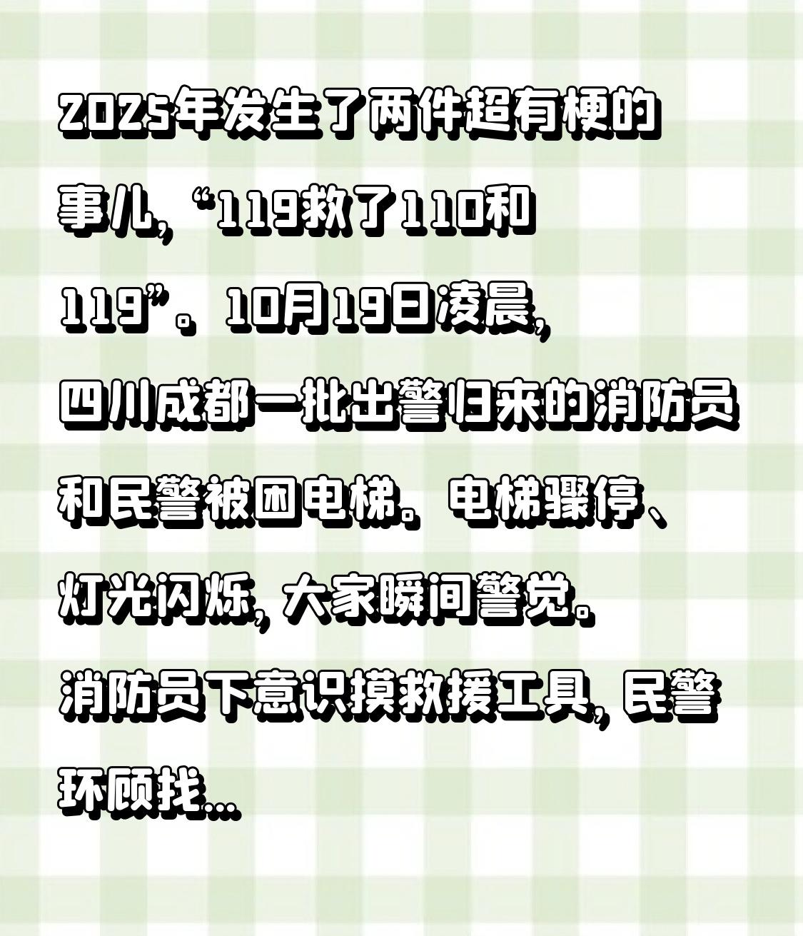 2025年发生了两件超有梗的事儿,“119救了110和119”。10月19日凌晨,四川成都一批出警归来的消防员和民警被困电梯。电梯骤停、灯光闪烁,大家瞬间警觉。消防员下意识摸救援工具,民警环顾找线索。不过他们很快冷静自救,凭借专业知识检查部件、判断位置,仅13分钟就成功脱困。 10月26日,云南昭通消防员与民警出警收队也被困电梯,最后同事赶来将他们解救。这画面诙谐又暖心,网友纷纷调侃“119救了110和119”。平日里守护他人的他们,这次成了被救对象,但专业冷静依然在线,必须致敬!