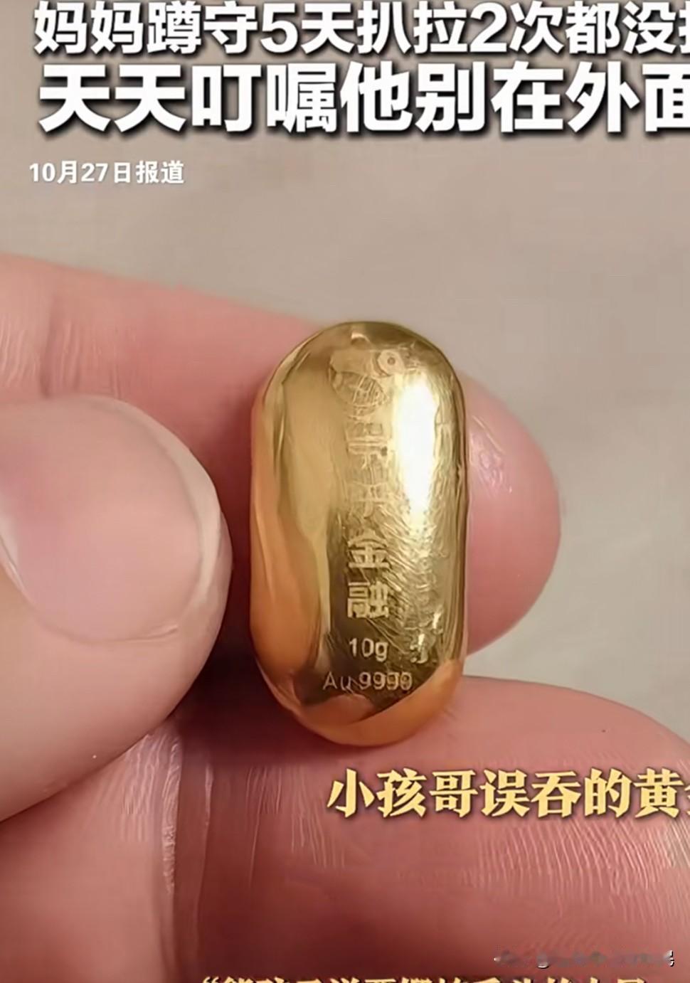 小孩哥脑回路清奇,为了锻炼舌头把家里10克的黄金豆放到嘴巴里,谁知一不小心给吞到肚子里了。 赶紧喊妈妈:妈妈你快过来,我要死了,我把金子吞到肚子里了。 妈妈以为是儿子开玩笑,一开始并没有重视,直到发现金豆子的盒子里真的没了才着急。 妈妈在网上查询,发现金豆子可以自己排出体外,就叮嘱孩子一定要在家里排便💩。但是五天内妈妈扒拉了两次孩子便便都没有金豆子。有点着急赶紧跑医院做检查,医院诊断孩子胃内有异物,但是孩子没有腹痛呕吐等不适的症状就开了一些排便的药物,叮嘱多吃一些粗纤维的食物,就诊的当天孩子就把金豆子排出来了。 小孩子想法真的天马行空,不过确实不能在外边拉,哈哈哈,这个真是个呑金兽了。以前我表弟小时候吞过硬币,最后也是自己拉出来了。