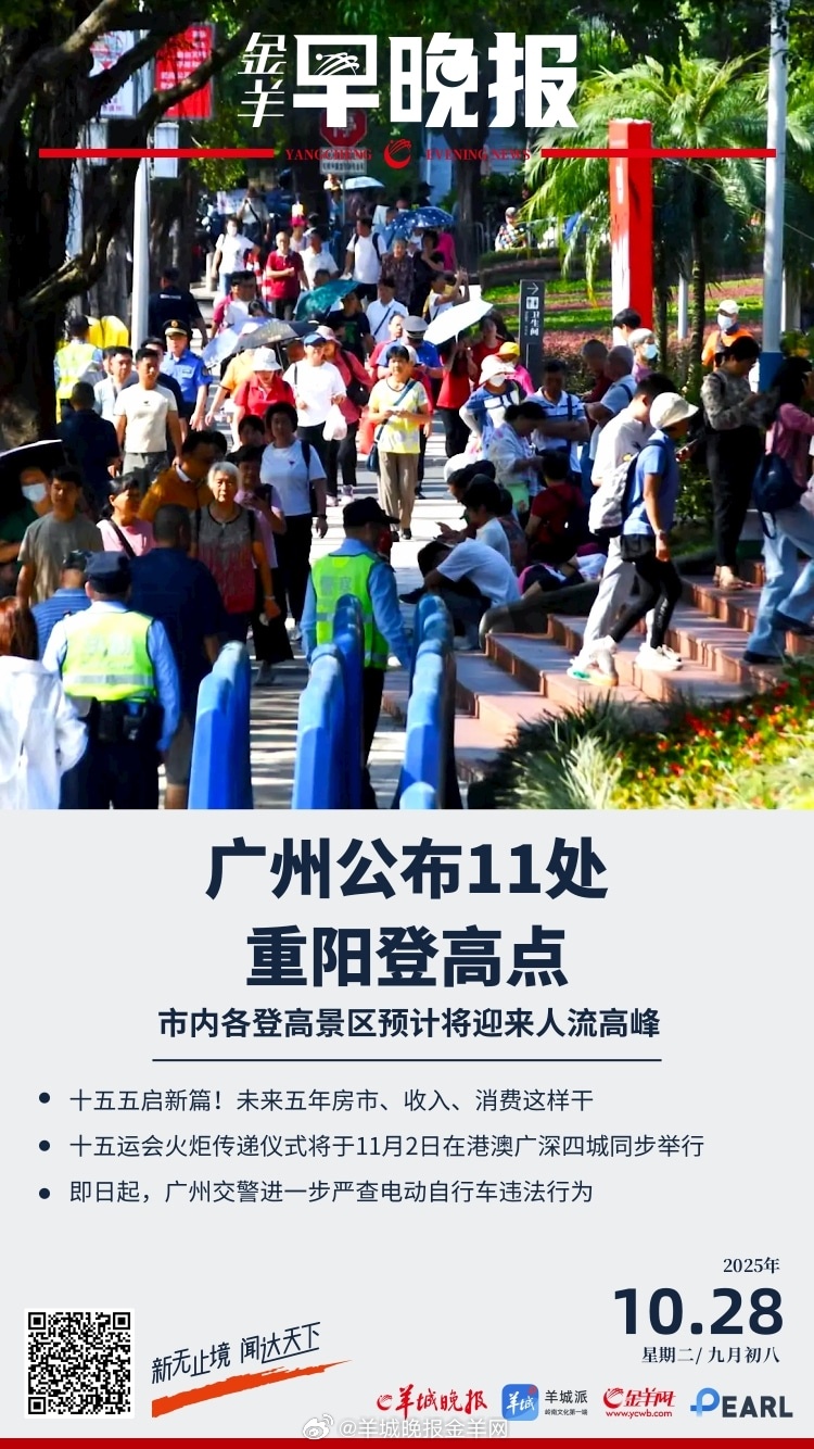 #金羊早晚报# 即将迎来人流高峰!广州公布11处重阳登高点;十五五启新篇!未来五年房市、收入、消费这样干;神二十一在发射场区进行全系统合练,具备发射条件;世界唯一!我国在北极密集海冰区进行连续载人深潜;京东前副总裁蔡磊进入渐冻症晚期,研发药物对病友起效对自己没用;海口警方通报男子殴打交警:排除酒驾毒驾,已被刑拘;共设火炬手200棒!十五运会火炬传递仪式将于11月2日在港澳广深四城同步举行;广东出生人口全国第一,是经济底气与文化基因的双重胜利;第七届世界客商大会将于11月23日—25日在梅州举行;广东公示民办高校2024年检查结果:2所优秀,6所基本合格;即日起,广州交警进一步严查电动自行车违法行为;10月以来广州口岸离境退税申请金额超3400万元,创历史新高;纪录片《因为长江》10月27日开播,跨越山海述说千年文脉;《疯狂动物城2》官宣中文配音阵容,大鹏、费翔、金晨都将献声新角色;“停摆”之下,美国联邦食品救济将暂停;特朗普:俄罗斯试射核动力巡航导弹“不合适”。#第十五届全运会##南海坠机所在航母正执行最后任务##KK园区所在村镇出租车费已翻倍# 更多精彩报道,请扫码关注羊晚全媒体报道!