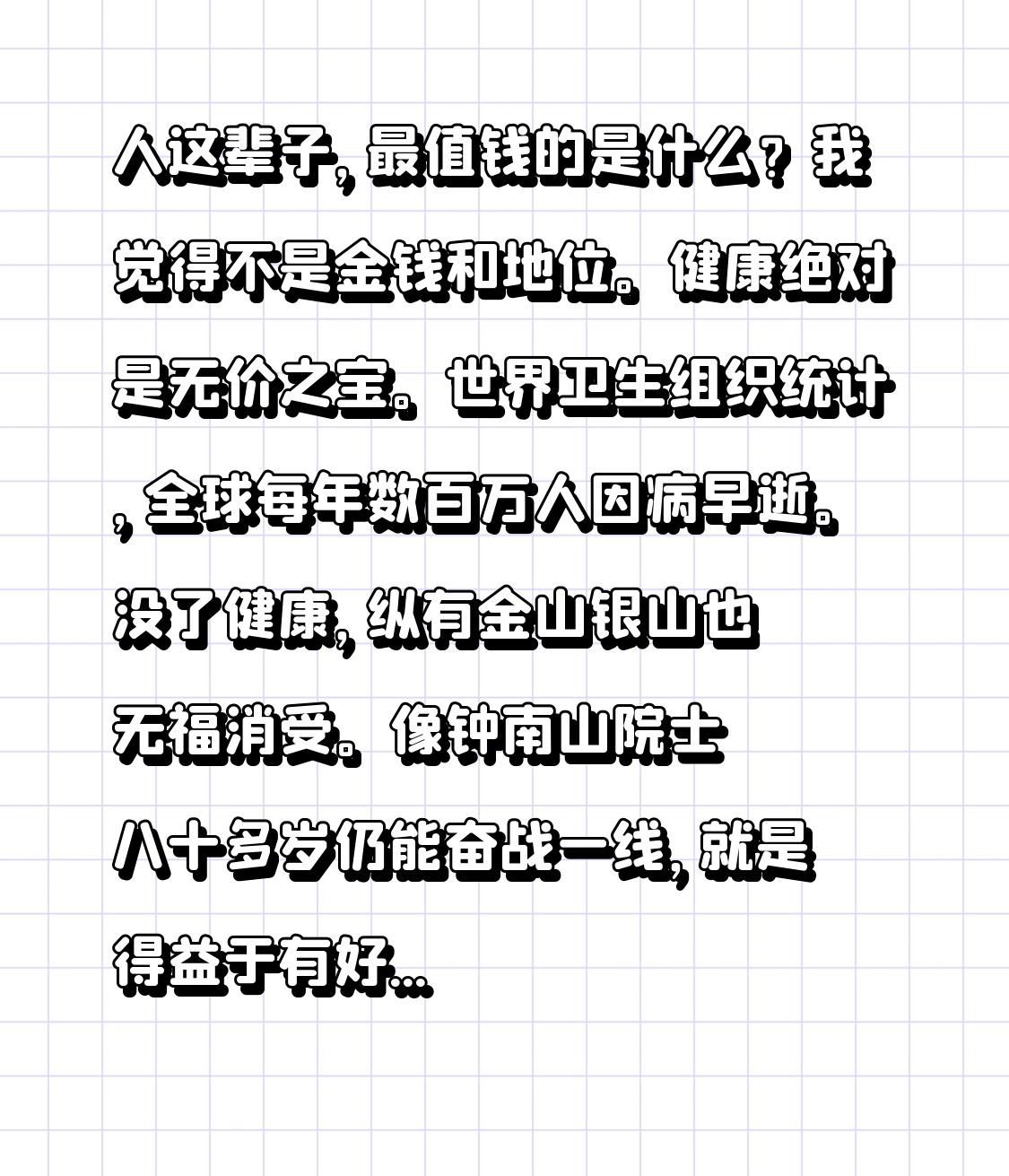 人这辈子,最值钱的是什么?我觉得不是金钱和地位。 健康绝对是无价之宝。世界卫生组织统计,全球每年数百万人因病早逝。没了健康,纵有金山银山也无福消受。像钟南山院士八十多岁仍能奋战一线,就是得益于有好身体。 亲情也是极为珍贵的。从出生起,家人的关爱就如暖阳。遇到困难,家人是坚强后盾;获得成功,家人真心为你骄傲。 还有善良,帮老人扶起菜篮,给外卖员递瓶水,这些善意看似微小,实则为自己的人生铺路,善良是稳赚不赔的储蓄。