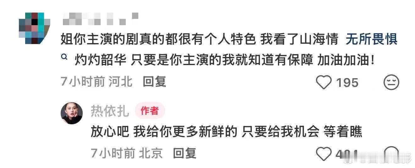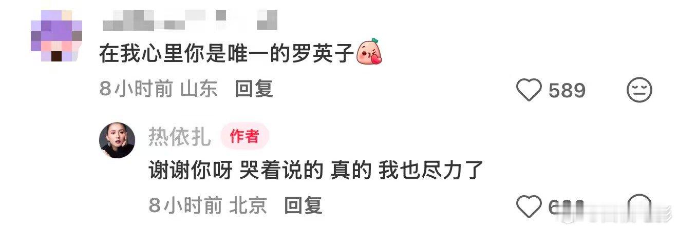 评论区有网友留言“在我心里你是唯一的罗英子”热依扎回复“谢谢你呀 哭着说的 真的 我也尽力了”无所畏惧