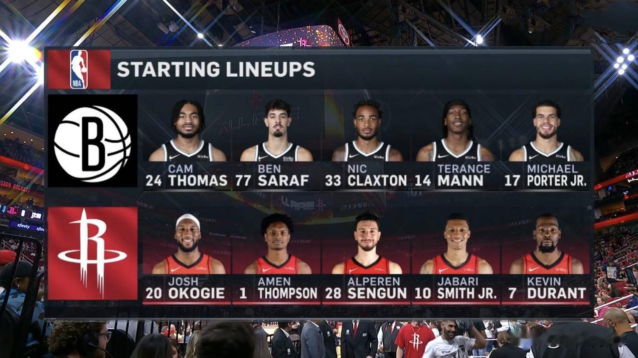 休斯顿火箭第三场还是调整了阵容,将奥克吉拿上首发,上半场收效很好,队伍灵活了很多,塔里·伊森作为替补半场20分,继续保持住。 一、火箭首发: 1、申京 2、贾巴里·史密斯 3、奥克吉 4、杜兰特 5、阿门·汤普森 二、篮网首发: 1、小火车托马斯 2、小波特 3、曼恩 4、克拉克斯顿 5、撒拉夫