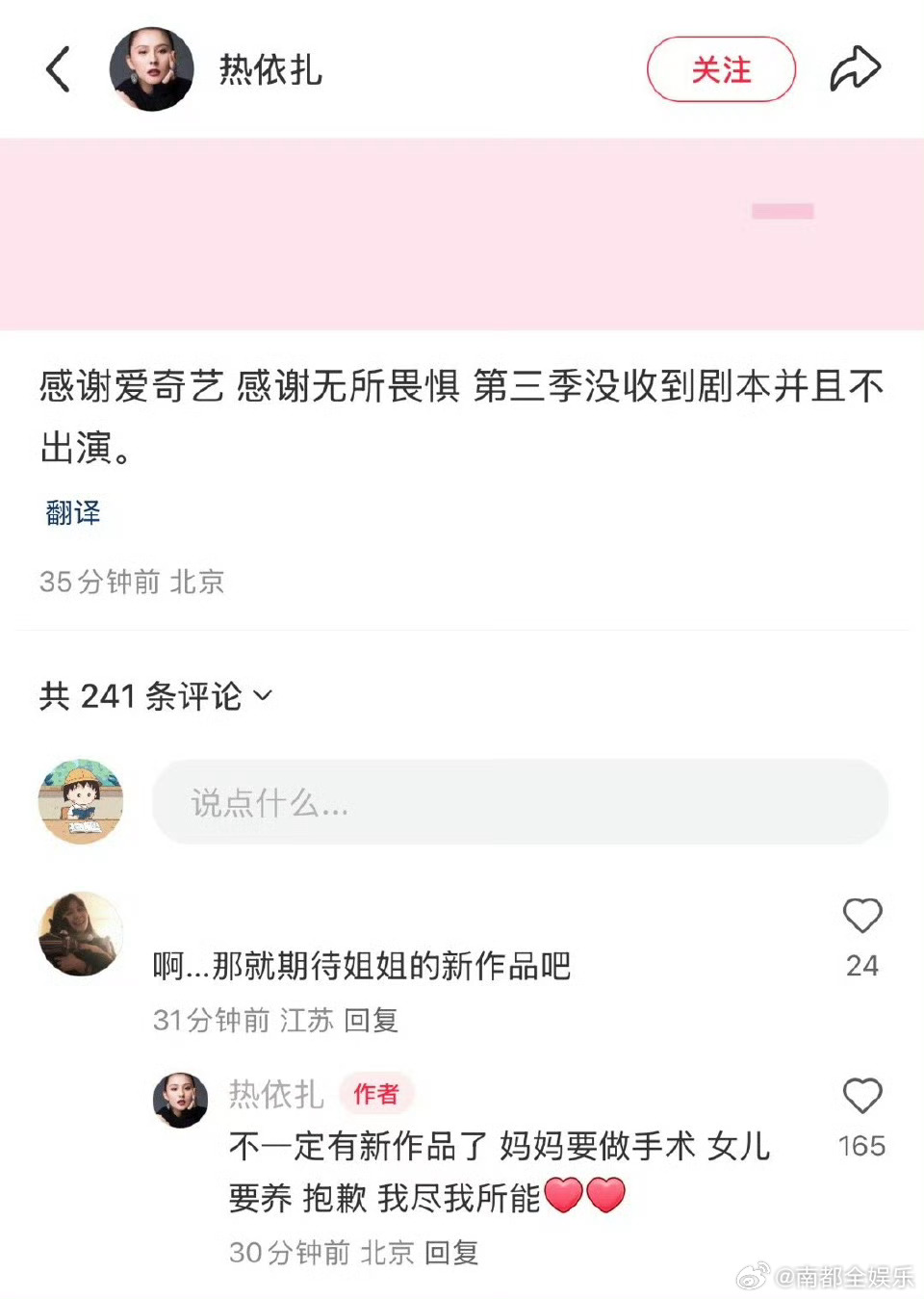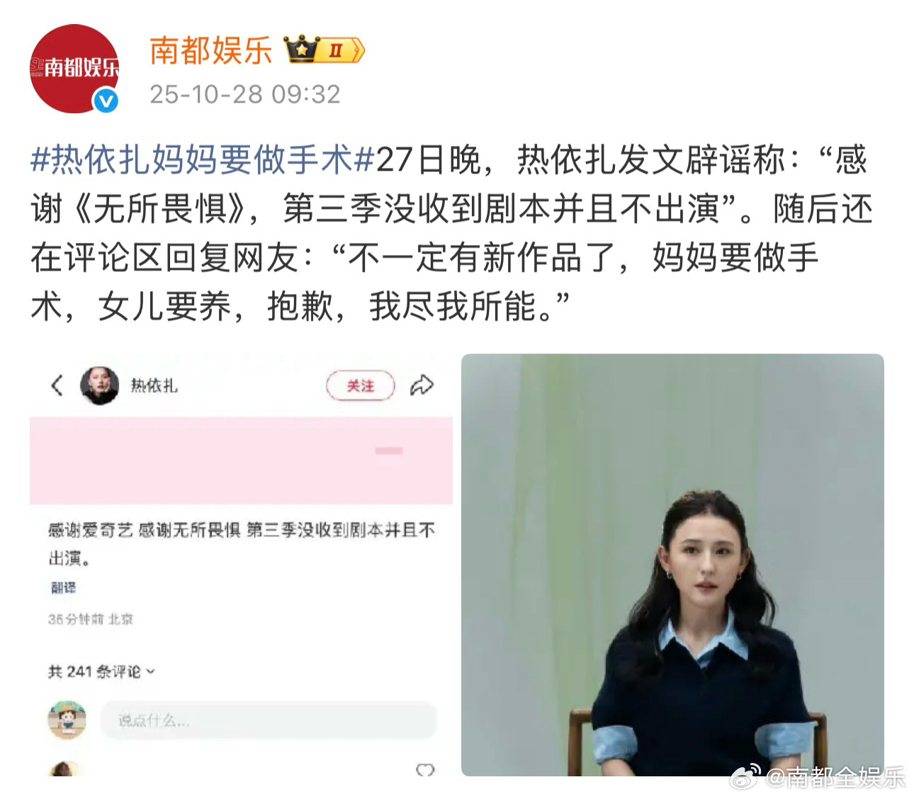 编剧称还不清楚热依扎不出演的具体情况编剧说热依扎是唯一的罗英子热依扎不出演无所畏惧327日晚,热依扎发文称自己不出演《无所畏惧3》,引发热议。编剧赵冬苓也在评论区留言:“扎扎,我在海上旅行,你这是给了我一劈雳。一直没见你,等我回去见见好吗?你是唯一的罗英子!我十二月才回去,一玩起来差点误大事,我回去后通过谭导联系你。”