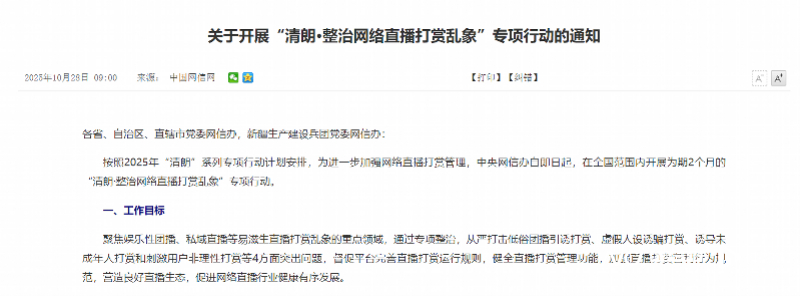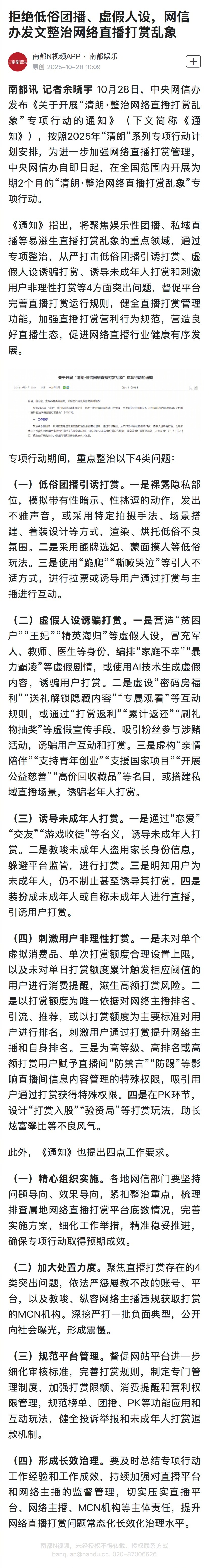 #清朗行动严打诱导未成年人打赏#【拒绝低俗团播、虚假人设,网信办发文整治网络直播打赏乱象】#清朗行动整治直播打赏乱象#10月28日,中央网信办发布《关于开展“清朗·整治网络直播打赏乱象”专项行动的通知》(下文简称《通知》),按照2025年“清朗”系列专项行动计划安排,为进一步加强网络直播打赏管理,中央网信办自即日起,在全国范围内开展为期2个月的“清朗·整治网络直播打赏乱象”专项行动。
