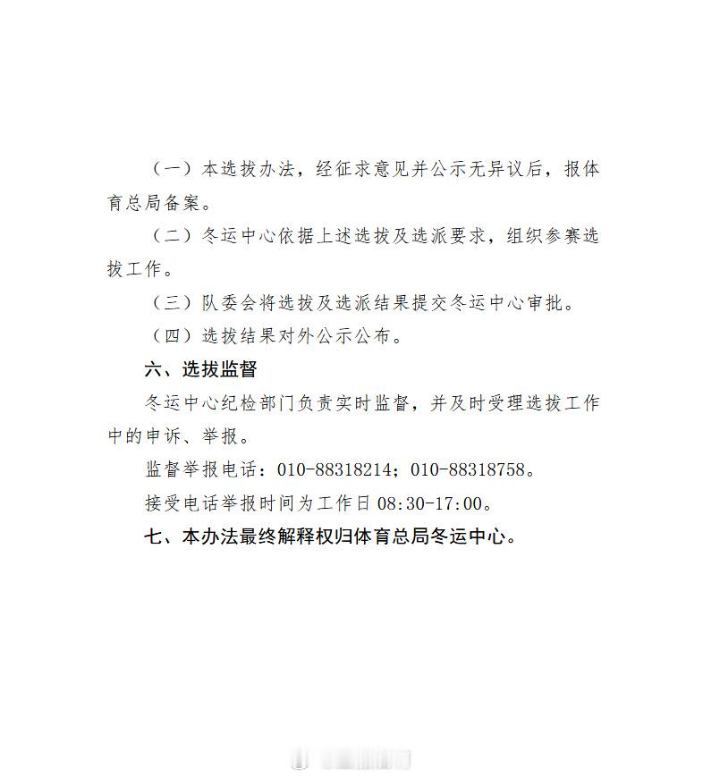 队委会将根据以下条件进行综合评估:2025/2026 赛季世界巡回赛比赛表现和参赛成绩;接力比赛表现,接力人员将根据心理稳定性,交接配合度和推人速度差值;推人交接过人成功率;超越和防守路线;个人滑行失误次数等因素进行选定;个人训练能力水平;顺位递补,如已入选运动员由于违规违纪或伤病等原因无法参加,确认取消其入选资格,顺位递补符合条件的运动员入选