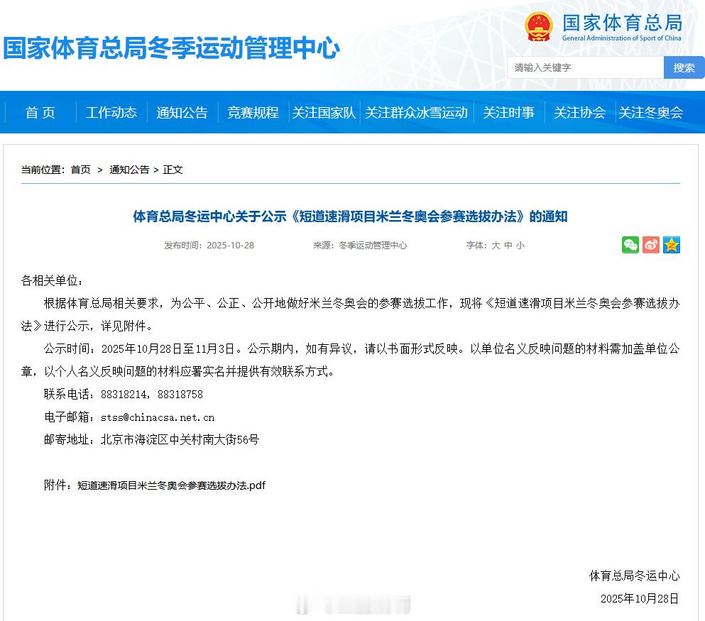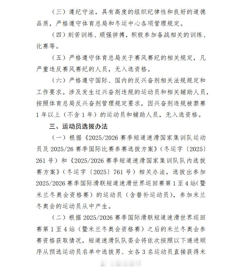 选拔出参加2025/2026 赛季国际滑联短道速滑世界巡回赛第 1 至 4 站(暨米兰冬奥会资格赛)的运动员(含替补运动员),参加米兰冬奥会的运动员从中产生
