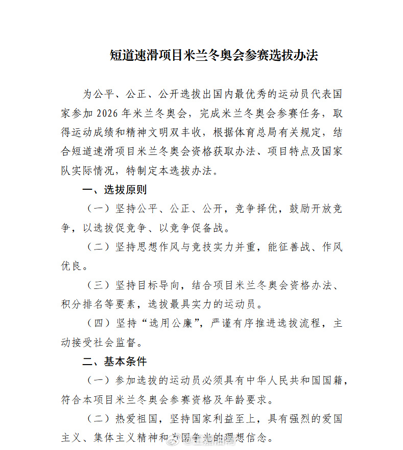 为公平、公正、公开选拔出国内最优秀的运动员代表国家参加 2026 年米兰冬奥会,完成米兰冬奥会参赛任务,取得运动成绩和精神文明双丰收,根据体育总局有关规定,结合短道速滑项目米兰冬奥会资格获取办法、项目特点及国家队实际情况,特制定本选拔办法
