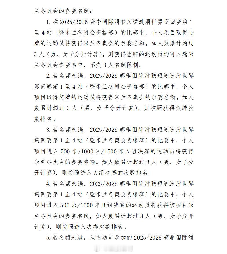 在2025/2026 赛季国际滑联短道速滑世界巡回赛第 1至 4 站(暨米兰冬奥会资格赛)的比赛中,个人项目取得金牌的运动员将获得米兰冬奥会的参赛名额。如人数累计超过3 人(男、女子分开计算),则获得金牌的运动员均可入选米兰冬奥会参赛名单,不受 3 人名额限制