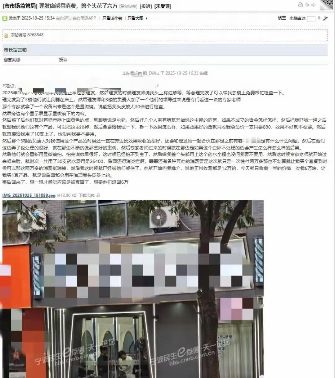 10月27日据报道,宁波一网友反映,去理发店剪头发一次花了6万元,该网友质疑理发店诱导消费。该网友表示,10月24日下午自己去理发店理发,期间理发师声称其头上有红疹,可以免费检查。检查后说有虫卵,可以用药水清理,一支880元,店方使用了30支。用完后再检查,称效果很好看不到虫卵了。随后,宁波高新区市监局工作人员告诉记者,已收到相关投诉,将会对此事进行核实调查。 有网友表示:治疗已经超出了理发店的职能范围,更是不在经营范围内,更没有资质进行治疗操作。违法行为:超范围经营,非法行医。 这已经不是民事纠纷,而是欺诈,应由警察进行刑事立案进行侦办,查清到底有多少受害者,涉案金额肯定不是小数目。 这个所谓的药水,大概率是三无产品,并且没有明码标价。肯定是违法行为,但这个违法具体归谁管,还是说涉嫌欺诈。 和房顶漏雨一个套路,自己配的药水,成本极低甚至一两元,用量没有上限,没做之前一直回避总价格,只是说用不了你多少钱,现在房屋漏雨套路都逮到判刑,没带到的改行理发了,亲戚带亲戚朋友带朋友,都是诈骗套路。 对此大家怎么看呢
