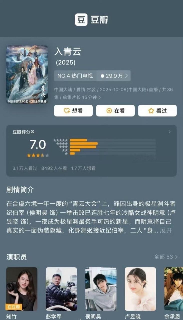 卢昱晓[超话]侯明昊卢昱晓入青云豆瓣7.0分入青云豆瓣开分7都去看入青云啊!!!
