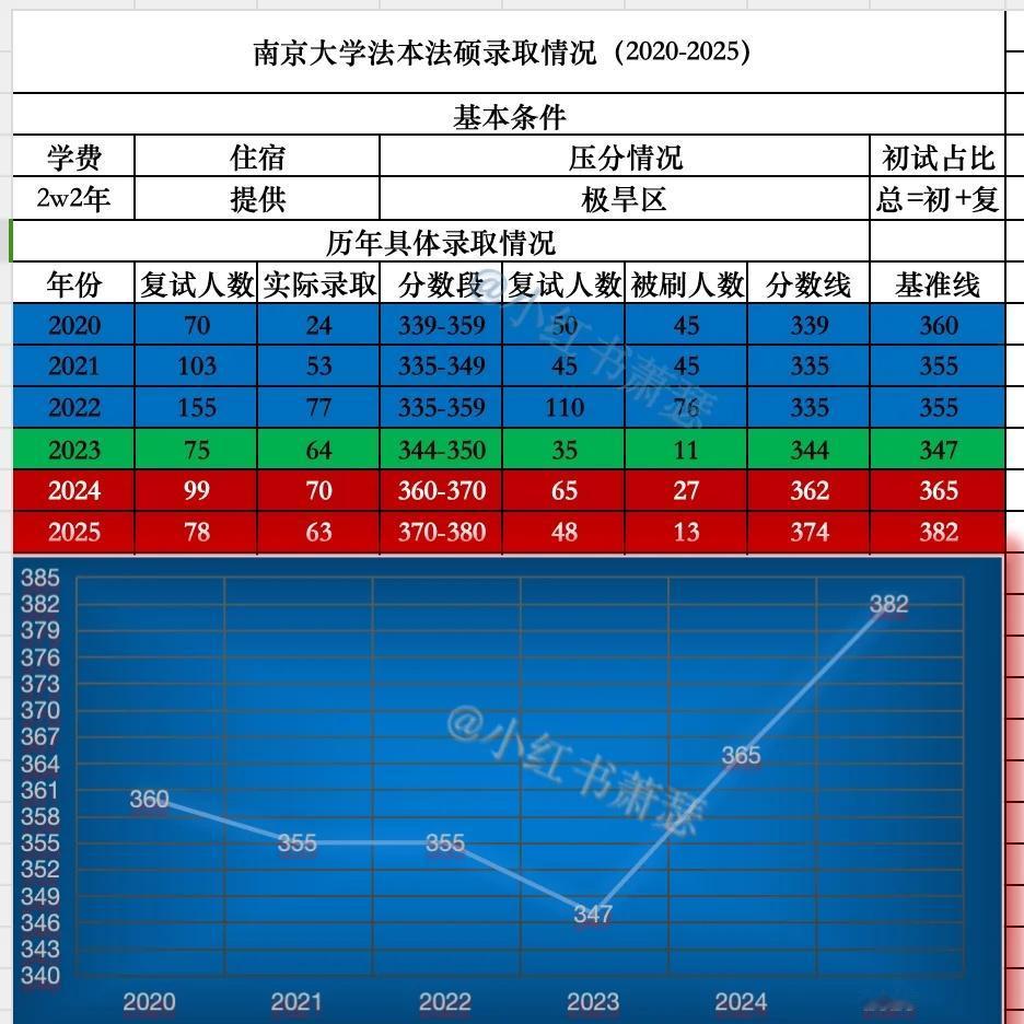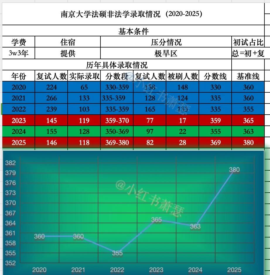 压轴:南京大学 最后一篇关于学校的数据了。先说基本面吧,非法学今年热度降了,法本也是,但是法本好像热度没有降的特别多。今年无论法本还是非法本都大概率难度相比去年会降,但是法本预期不要太高哈 高分是由于去年江苏超级大放水,而且由于23年以后南京大学开始波动,特别是法本小年以后连续两次大年(这个是蛮罕见的)。还有一个点就是,去年好多南京大学甚至南京师范的落榜生都在武汉找到了很好的退路,但是今年江苏会不会继续放水,真心难以预测~ 法硕择校 26法硕
