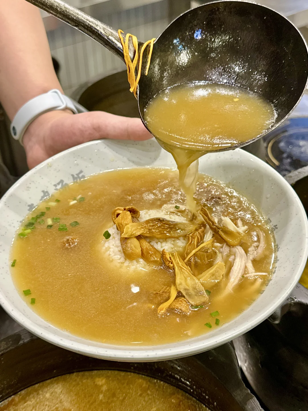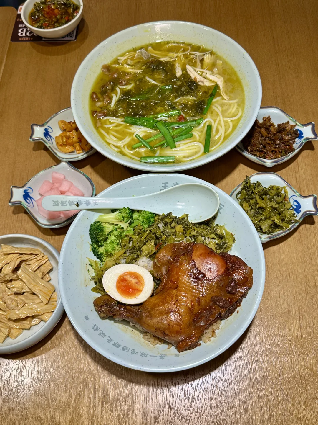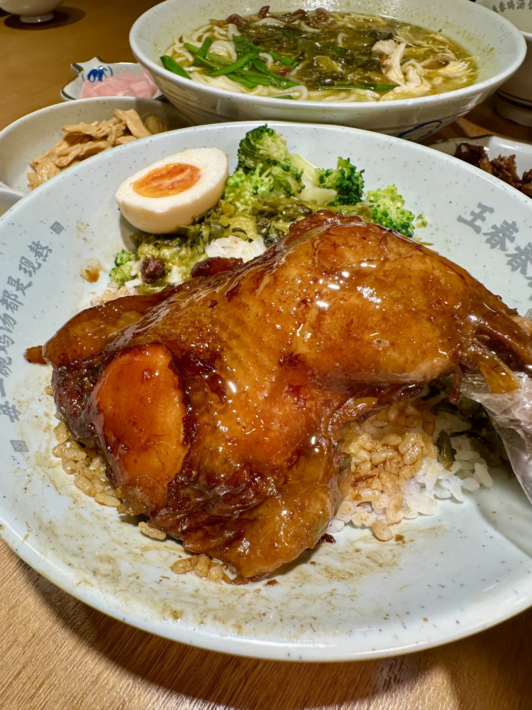 王春春鸡汤饭五店齐开,手枪腿饭+酸辣鸡汤米线双杀打工人味蕾[哇R] ✅ 霸气手枪腿饭:不是鸡腿!是超大只手枪腿!卤得色泽红亮,酱香深入肌理,咬一口肉质软烂入味,搭配溏心蛋、西兰花和酸香开胃的酸菜,每一口都是碳水暴击的快乐~ ✅ 姬松茸鸡汤饭:现熬的鸡汤浇在米饭上,辅以姬松茸提鲜,汤头浓郁不腻,米饭吸饱汤汁,一口暖到心坎里; ✅ 酸辣鸡汤米线:米线爽滑劲道,酸辣开胃,鸡肉鲜嫩入味,嗦一口米线喝一口汤,酸辣鲜香全在嘴里炸开~