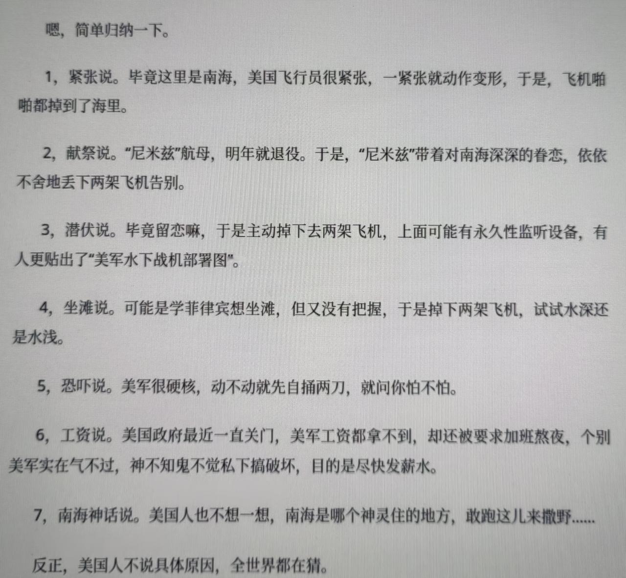 美国飞机在南海扑通扑通向下掉,世界一脸惊愕:有啥让美国想不通的?网民们热心地纷纷出主意,“牛弹琴”热心的给归纳一下,看看吧。 “嗯,简单归纳一下。 1,紧张说。毕竟这里是南海,美国飞行员很紧张,一紧张就动作变形,于是,飞机啪啪都掉到了海里。 2,献祭说。“尼米兹”航母,明年就退役。于是,“尼米兹”带着对南海深深的眷恋,依依不舍地丢下两架飞机告别。 3,潜伏说。毕竟留恋嘛,于是主动掉下去两架飞机,上面可能有永久性监听设备,有人更贴出了"美军水下战机部署图”。 4,坐滩说。可能是学菲律宾想坐滩,但又没有把握,于是掉下两架飞机,试试水深还是水浅。 5,恐吓说。美军很硬核,动不动就先自捅两刀,就问你怕不怕。 6,工资说。美国政府最近一直关门,美军工资都拿不到,却还被要求加班熬夜,个别美军实在气不过,神不知鬼不觉私下搞破坏,目的是尽快发薪水。 7,南海神话说。美国人也不想一想,南海是哪个神灵住的地方,敢跑这儿来撒野...... 反正,美国人不说具体原因,全世界都在猜。”
