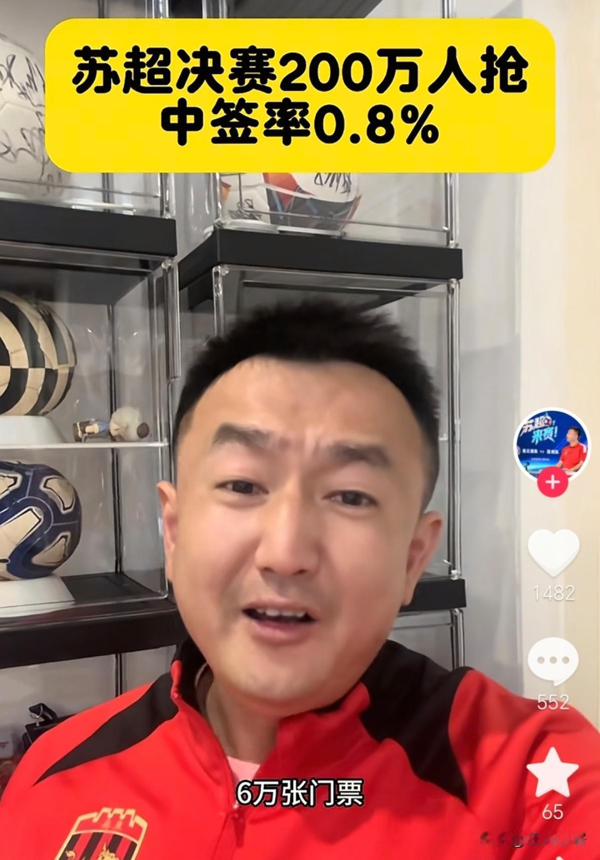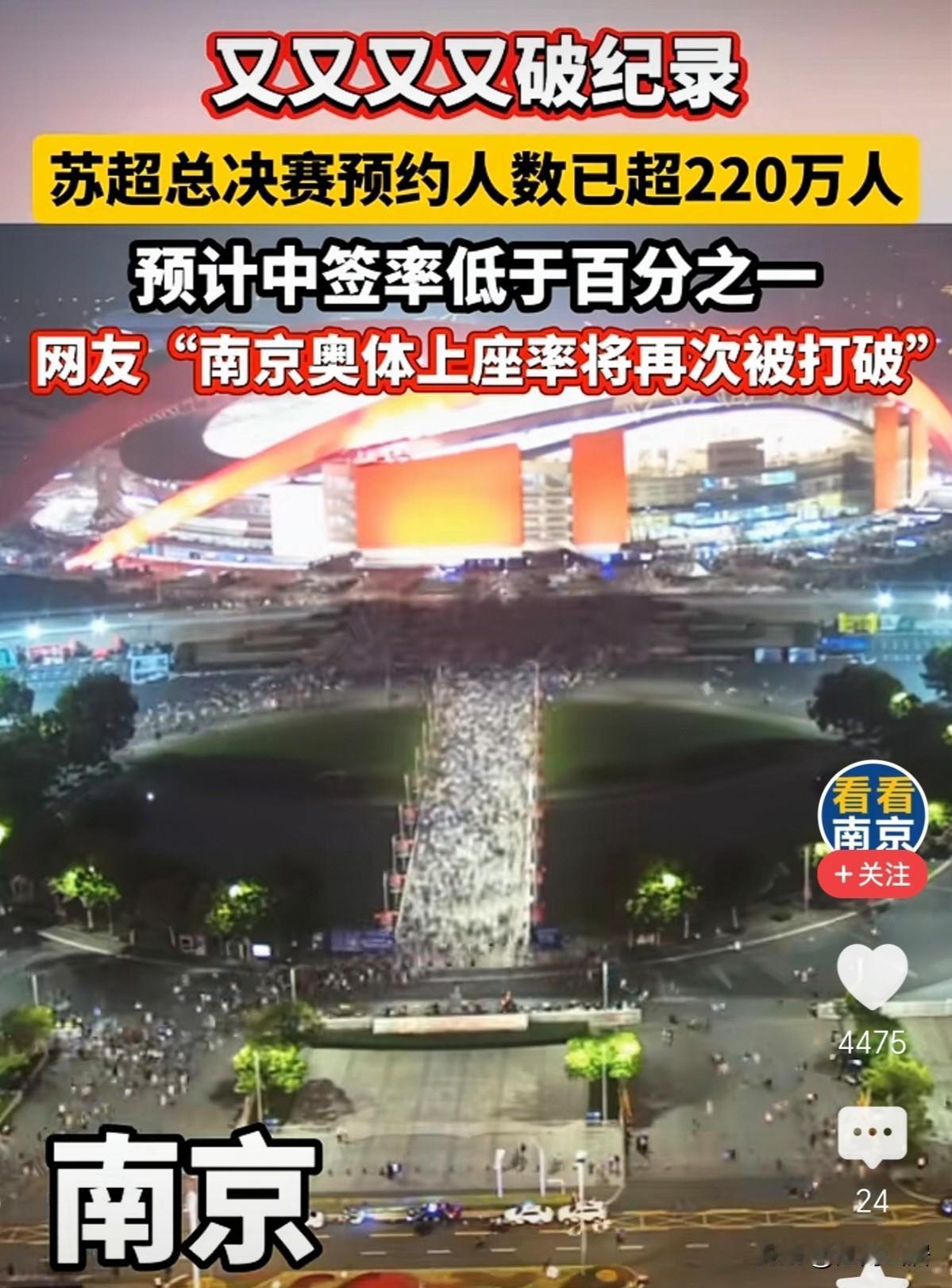 11月1日,在南京举办的苏超决赛,目前已经有220多万预约人数,共抢6万多张门票,中签率低于1%。可见球迷们对这次的南通vs泰州的总决赛,非常的热情与期待,参与度和关注度非常高。估计决赛当晚,南京奥体中心的上座率,又会创新高。双雄争霸,谁与争锋,冠军将花落谁家,一起期待吧!