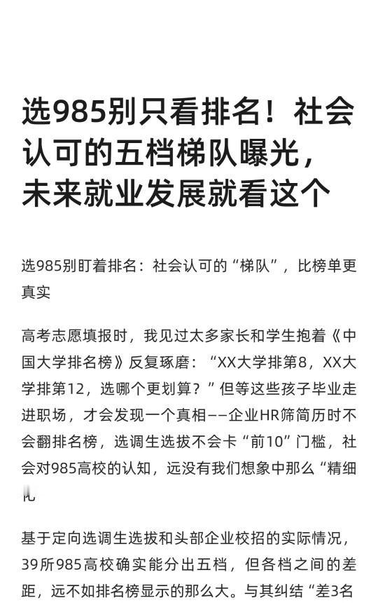 选985别只看排名!社会认可的五档梯队曝光 我有个朋友是某互联网公司的HR,她告诉我:“我们招校招生,首先看‘是否985’,其次看‘专业是否匹配’,最后看‘实习经历’——至于排名第5还是第15,根本不重要。”这句话点透了社会对985的认知:985是一道“资格门槛”,跨过去之后,拼的是你的专业能力、实践经验,而非学校的排名。 所以,选985别再盯着排名榜纠结了。真正影响你未来的,从来不是“学校排第几”,而是这三个问题: 1.这所学校的优势专业,是不是你感兴趣的?2.学校所在的城市,有没有你想进入的行业?3.你能在这所学校里,学到多少能变现的技能? 排名是给外人看的,而你的未来,是自己走出来的——毕竟,没有一所985能保证你“躺赢”,但每一所985,都能给你“赢的机会”。高校就业率