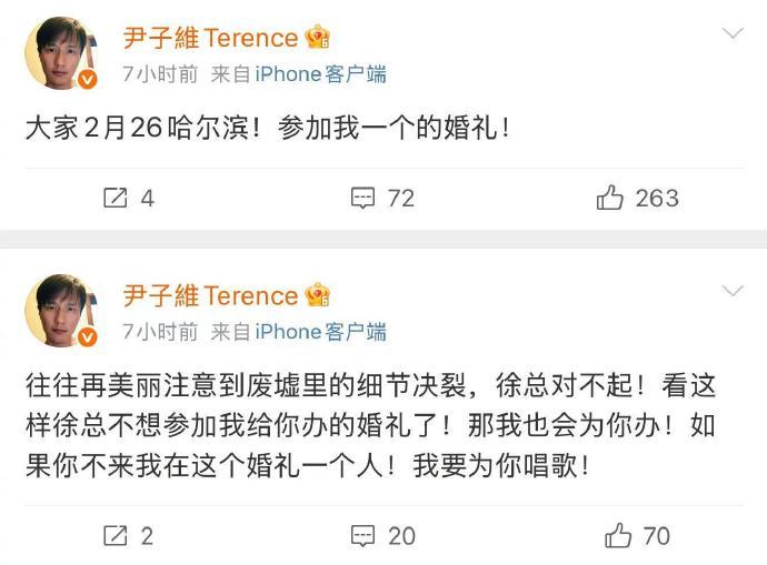 疑似尹子维徐冬冬婚礼前闹矛盾 还以为今年终于能看到尹子维徐冬冬办婚礼了,没想到疑似又闹矛盾了!尹子维半夜发文说 “往往再美丽注意到废墟里的细节决裂,徐总对不起!看这样徐总不想参加我给你办的婚礼了!那我也会为你办!如果你不来我在这个婚礼一个人!我要为你唱歌!” 这到底是什么回事啊,蹲一个徐冬冬回应!