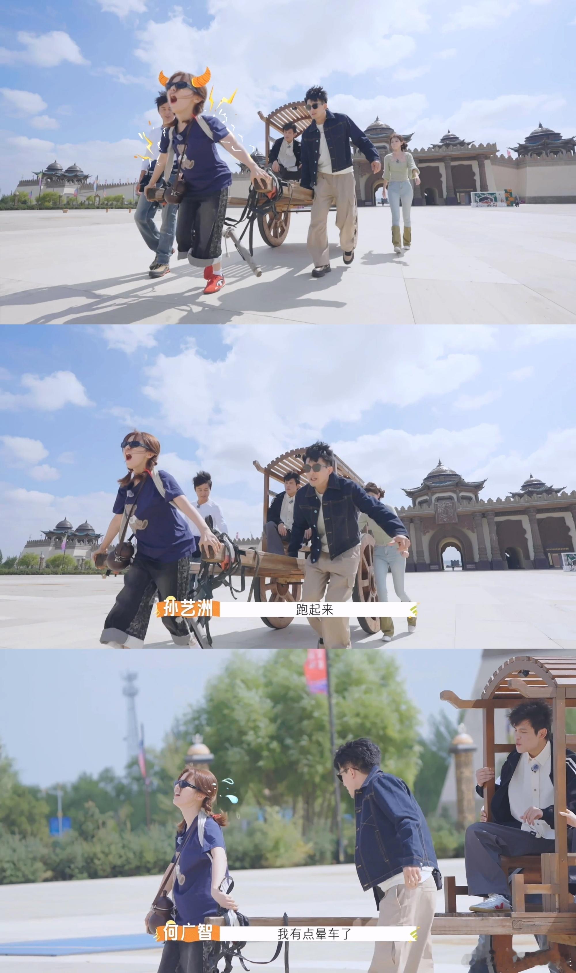 杨超越人力拉车好大的力气 《非来不可3》里杨超越太拼了!徒手拉人力车载何广智,下蹲时稳稳撑住,发力时的认真劲儿超有魅力,这“怪力少女”人设太可了!