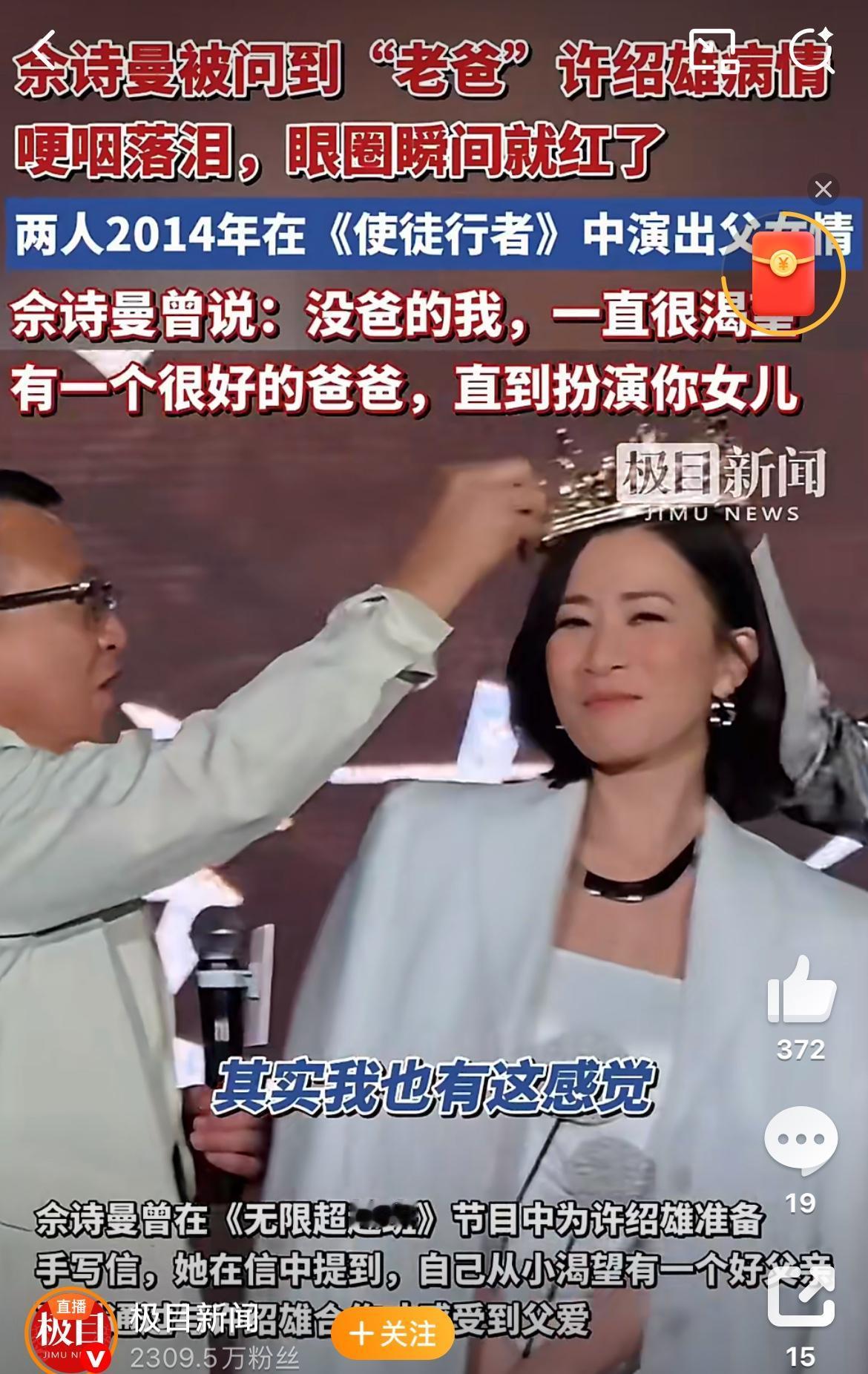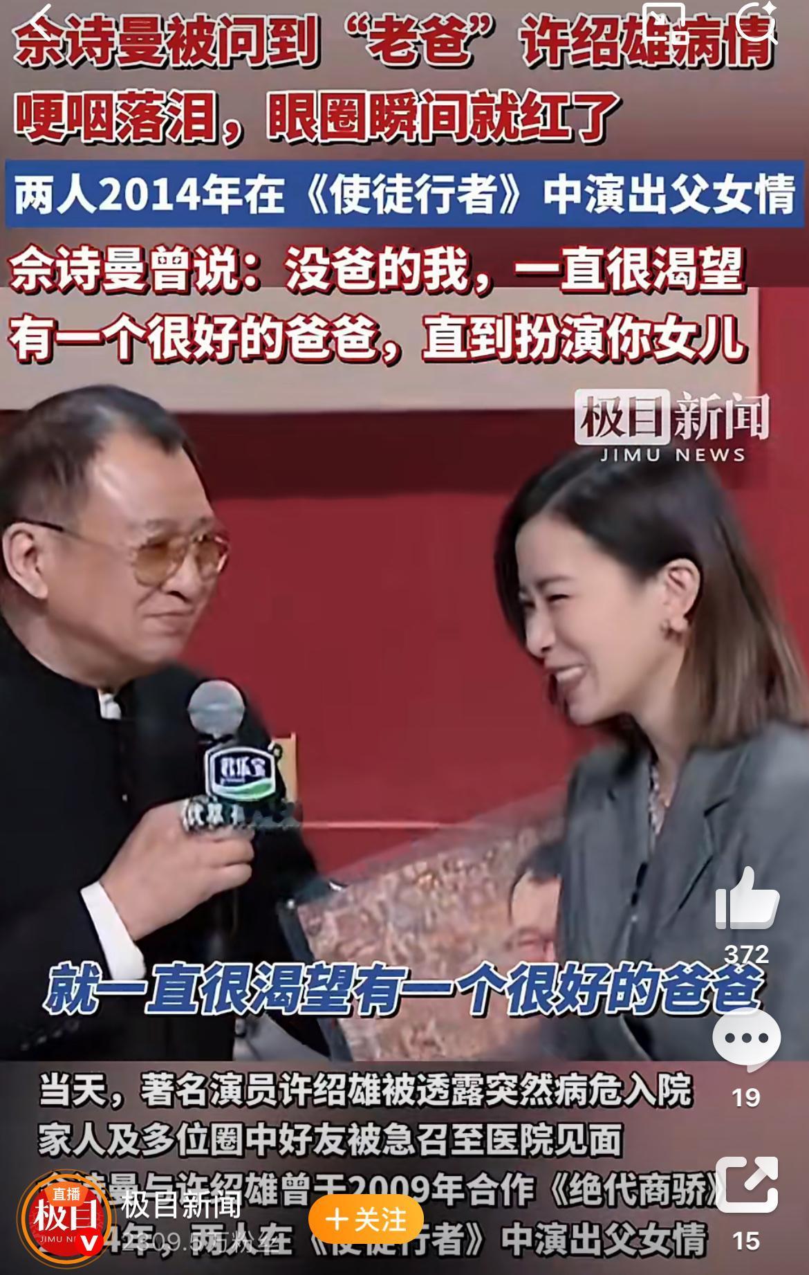 我只嫉妒佘诗曼一件事, 不是她和许绍雄合作过四部戏的缘分, 而是她能在戏外,把“老豆”这声称呼,从片场喊到生活里。 他们从《使徒行者》到《正义女神》演了太多次父女,许绍雄说两人有缘分,还认她做了干女儿。 佘诗曼曾经说没有爸爸的她希望有一个很爱她的爸爸,直到扮演了许绍雄的女儿,她才体会到什么父爱,许绍雄也把她当成自己的女儿了。 这样的缘分真的让人羡慕。 现在76岁的许绍雄病危住院,佘诗曼在澳门受访当场哭了,说早知道情况,一直在帮忙处理,还急着赶回香港探望。 这哪是普通的师徒情,分明是女儿对爸爸的牵挂。