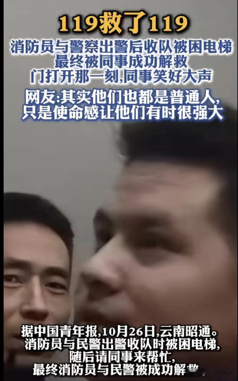 “哈哈哈哈家人们谁懂啊!云南昭通消防员和警察出警完,收队时居然被困电梯了!最后还是喊同事来救的,门一打开同事们笑到不行~ 咱就是说,平时都是他们救人,这次反过来被救,画面感绝了!其实他们也是普通人,只是使命感让他们总在冲锋。但被困电梯那一刻,他们和我们一样会慌会无奈。 这事儿也太可爱了,原来英雄也有这么接地气的一面!不过还是得给他们点个赞,出警辛苦还得遭这‘电梯劫’,幸好平安无事~果然,再强大的人也有需要被拯救的时候,这波‘119救119’的操作,真的又暖又好笑!”