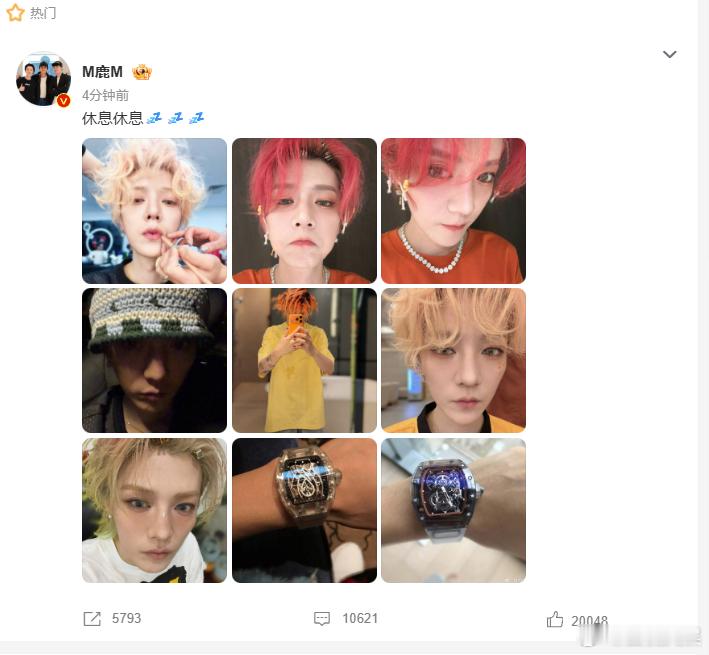 5 种发色与鹿晗的休息自拍相融,少女粉透着梦幻,浅亚麻显绅士,没有刻意摆拍的画面更显真切。鹿晗休息自拍鹿晗5种发色自拍