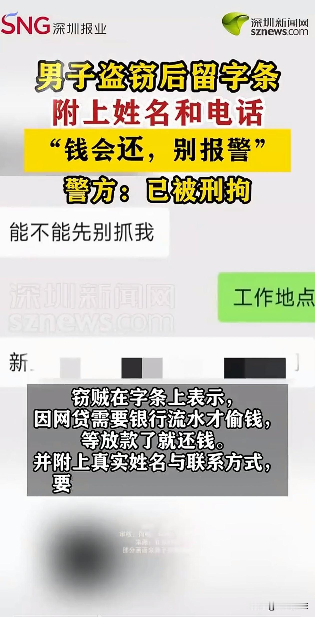 男子偷走几千元现金后,留下纸条,上面写着,别报警,会还钱,还留下了联系方式,失主加上他联系方式后却一直拖着不还。失主:太离谱了。 安徽,一市民去办公室,发现自己放着的几千块现金不见了,现场还留了一张纸条,上面写着,千万别报警,因网贷需要银行流水才偷钱,等放款了就还钱。 上面还有男子的名字和手机号,他让失主加他微信聊还钱的事。 失主虽然觉得奇怪,但想着能拿回钱就行,就加上了男子微信,催他还钱。男子虽然嘴上答应得好好的,却一直拖着不还,后来消息也不回。 失主没办法,报了警。警方一开始还以为是恶作剧或者障眼法,结果一查,纸条上的名字和手机号全是真的。 后来警方就假装是失主,通过微信跟男子聊天,并把他约出来见面,等男子一到,警方当场就把他抓住了。 原来,男子没正经工作,之前就因为盗窃被处理过。这次他是想偷点钱存进自己银行卡,制造“有流水”的假象,骗网贷平台放款。 他以为只要事后把钱还了,失主不报警,自己就没事。可没想到网贷没借到,偷来的钱也被他很快花光了。 现在男子已经被拘留了,等着他的肯定是法律的制裁。 男子自作聪明留纸条,承诺还款,以为能蒙混过关,结果还是把自己坑进去了。