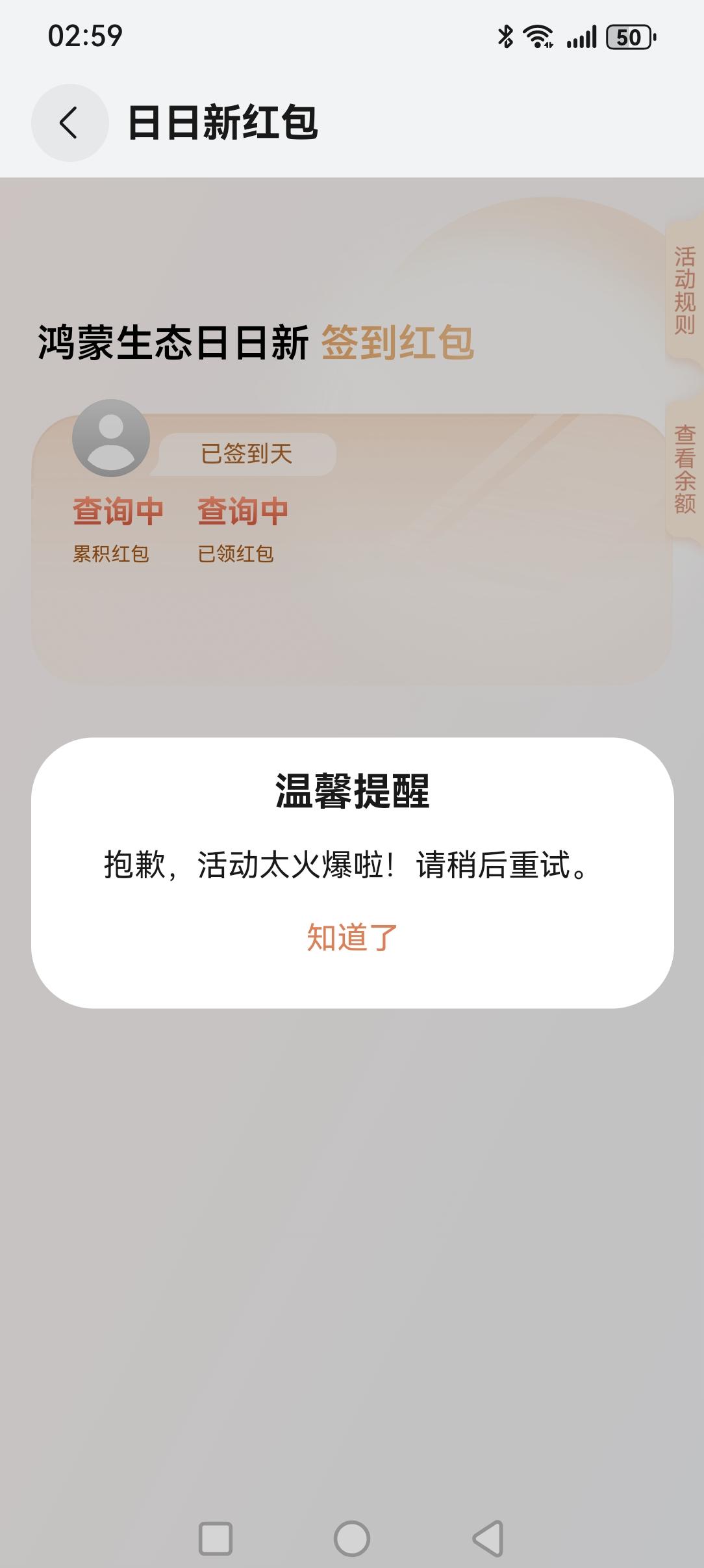 前天,我买了一部国产手机,营业员介绍说可抢60天红包,当天营业员帮我抢了99.99元,我昨天抢了4.6元。今天,活动太火爆,一直没有机会抢。