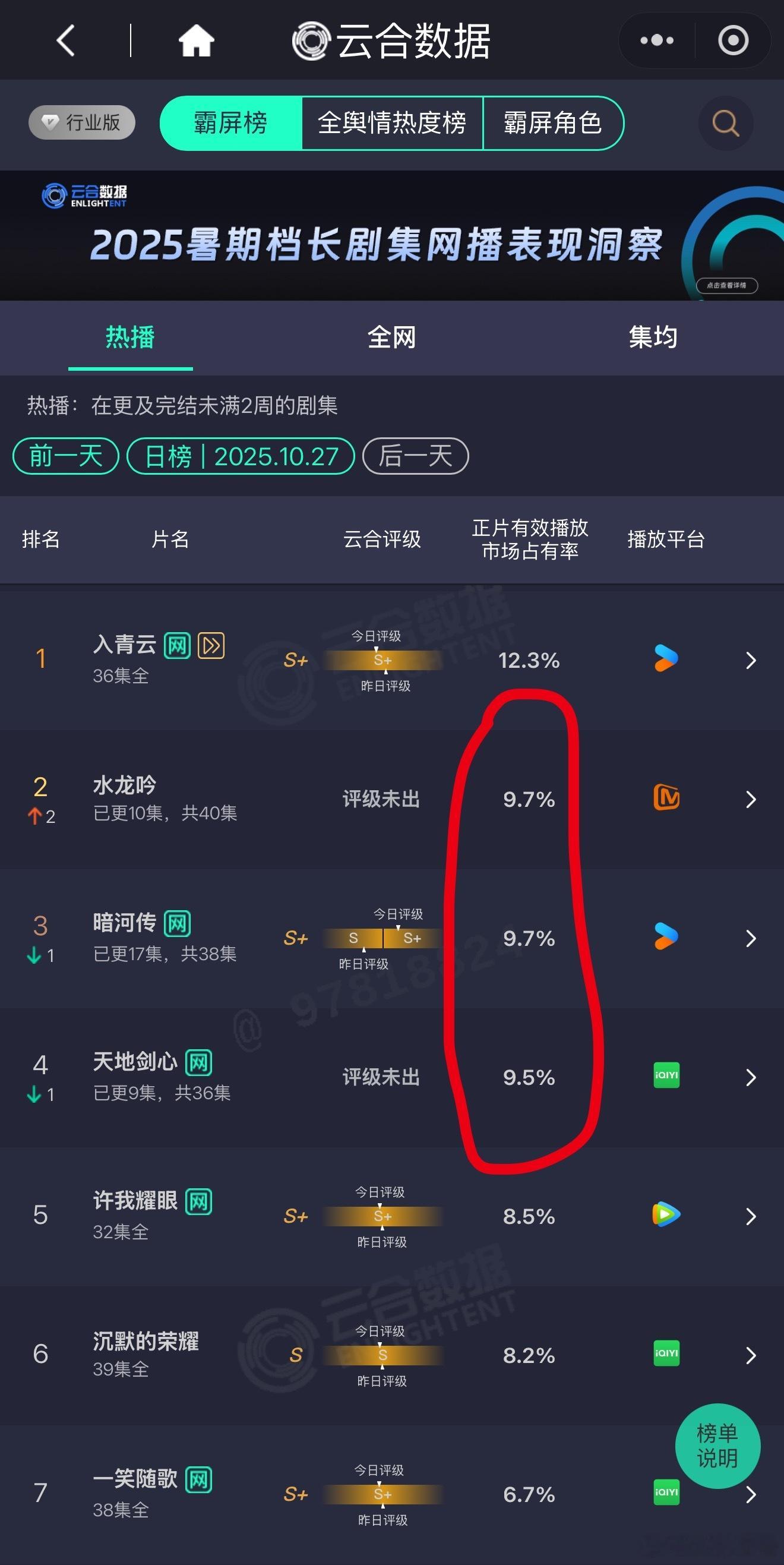 昨日云合,完结了几天的入青云还以12.3%在榜首,水龙吟9.7%,暗河传9.7%,天地剑心9.5%三个难兄难弟[笑cry]只能看后面谁来拯救大盘了