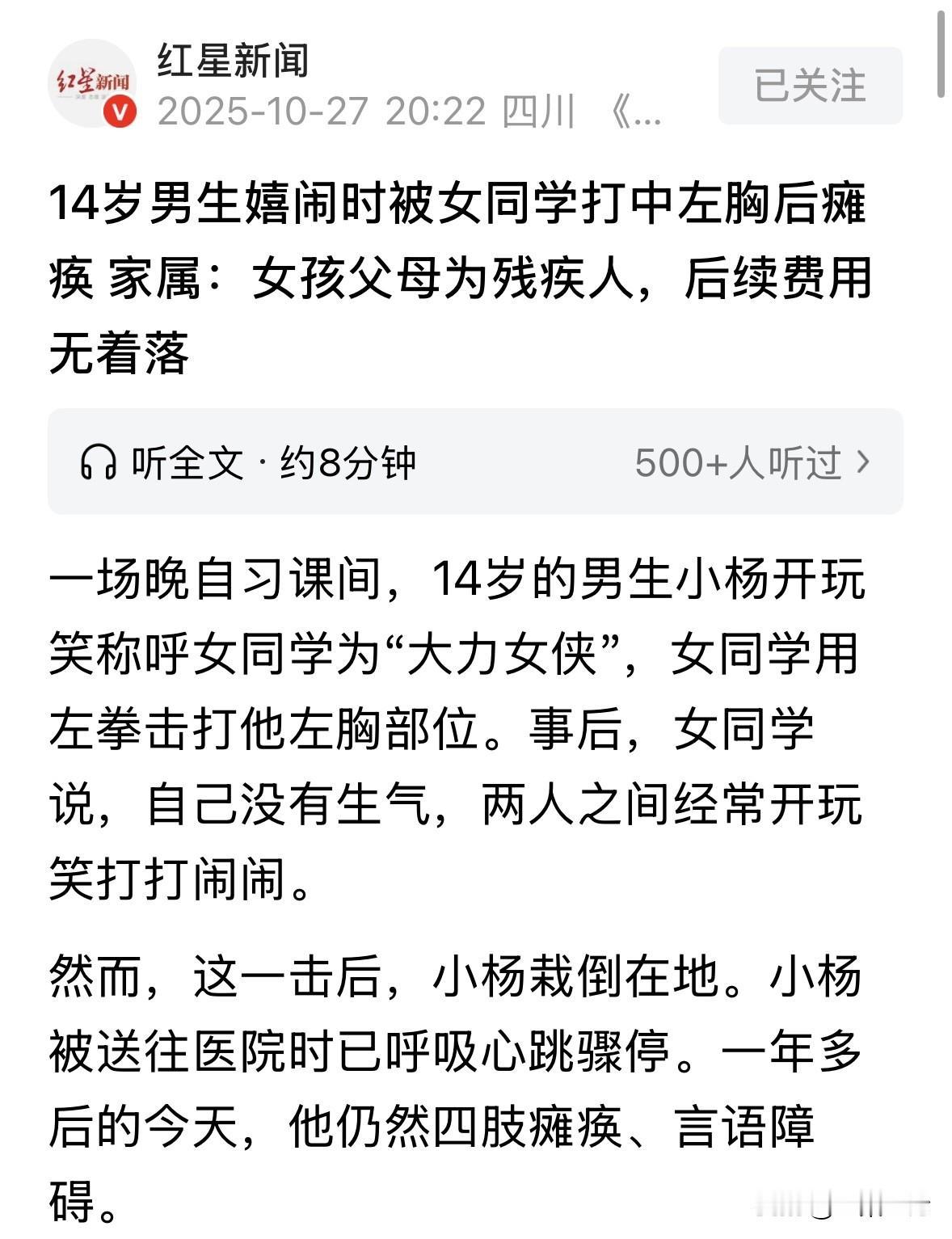 山东临沂,14岁男孩和女同学开玩笑打闹,被对方一拳打在左胸上,男孩当场倒地不起,一老师两次路过都没放在心上,没有采取任何急救措施,15分钟后,男孩才被送往医院,一年时间过去,男孩依旧瘫痪在床,治疗至今花了71万,事后法院判学校担责70%,女同学担责20%,然而,男孩一家虽然赢了判决,赔偿款却迟迟没有着落。 2024年5月21号,某中学的楼道里,14岁的小杨正和同班女生说说笑笑。 两人常开玩笑打闹,这次小杨依旧用开玩笑的口吻,随口对着女生说了句“大力女侠”,女生听后比划着要打小杨。 小杨本能地抬手防守,女生突然重重一拳砸在他左胸口。 小杨瞬间捂着胸口蹲下,紧接着脸朝下栽倒在地,再没动弹。 路过现场的物理老师看见后,蹲下来问了句“怎么了”,小杨没回答。 老师接了个电话就走了,后来返回瞥了眼小杨,又进教室转了一圈再次离开。 4分钟后,看着小杨倒在地上久久缓不过来,也没什么反应,其他同学连忙喊来另一位老师,这位老师掐了小杨人中,小杨才有了点吸气反应。 意识到问题的严重性后,老师连忙把小杨抬到自己车上,开车送去了医院,这时距离事发已经过去15分钟。 小杨在送医途中时已经出现尿失禁,抢救36分钟才恢复自主心率,49分钟后心跳才稳定。 医生诊断是呼吸心跳骤停、缺氧缺血性脑病。 从那天起,小杨在五家医院辗转住了303天,到2025年9月出院时,已经四肢瘫痪,不会说话,连吃饭都困难。 事后,小杨爸妈真是觉得天都塌了,他们无法接受,之前一个活蹦乱跳的娃,现在躺在那,连话都说不出。 他们想找学校和女生讨个说法,没想到却在鉴定上卡了壳。 法院委托了好几家鉴定机构,希望能够坚定学校,以及涉事女同学对小杨受到伤害的参与度、因果关系等等。 结果,几家机构都说不受理,要么说“情况太复杂”,要么说“不属于范围”。 一审时,法官审理认为,晚自习下课楼道里学生扎堆打闹,学校却没安排老师巡逻,小杨倒地后,物理老师没打120,没找校医,送医还是老师开车去的,没叫救护车,学校有很大过错。 至于女生家长说的“小杨本身有心脏病”,法院没采信。 因为两家医院的心脏超声都没发现异常,医生说是“短期心肌水肿”,不是先天毛病。 所以,一审法院判定学校需承担7成责任,女生赔2成,由监护人出,小杨自己担1成。 学校不服上诉,但二审依旧维持了原判。 原本以为事情到这里就尘埃落定了,没想到,事儿又卡在了赔偿款的落实上。 之前学校垫了44.6万,保险公司原本要赔50万,结果二审改判后,保险公司只给学校44.6万,给小杨家才5.6万。 小杨爸算了算,他们光前期治疗就花了71万,那位女同学家穷得叮当响,她爸一级残疾,妈是精神病人,靠爷爷奶奶捡破烂和低保过活,之前只凑出1万。 现在二审后保险公司才给5.6万,哪能够?他们为了给娃治病,已经掏空家底,四处借钱了,现在拿到的这点赔偿款,根本不够还,也弥补不上后续治疗的窟窿。 小杨爸妈因为这些事,心力交瘁,孩子现在天天躺床上,康复治疗一天都不能停。可他们没钱了,从今年9月就接回家保守治疗,那些花销大但效果好的治疗也根本做不起。 他们试过网络筹款,目标50万,最后只筹到1.5万,杯水车薪。 记者联系学校,工作人员只说有专人负责这件事,可提供的电话始终没人接。 小杨爸曾和这位“专人”通过话,对方说要申请鉴定,再起诉后续费用,最后补了句:我们服从法院判决。 那么,从法律角度,怎么看待赔偿款不到位的问题? 《保险法》第65条规定:保险人对责任保险的被保险人给第三者造成的损害,可以依照法律的规定或者合同的约定,直接向该第三者赔偿保险金。被保险人怠于请求的,第三者有权就其应获赔偿部分直接向保险人请求赔偿保险金。 责任保险的核心功能在于保障受害第三方的及时救济。 当被保险人,也就是学校,对第三者,也就是小杨负有确定的赔偿责任时,保险公司应优先向第三者支付赔偿金。 二审法院将保险金44.6万元直接返还学校,仅支付小杨5.6万元的做法,实质上违反了“被保险人未向第三者赔偿时,保险人不得向被保险人赔偿”的法定原则。 学校虽垫付了44.6万元医疗费,但该垫付行为并不等同于已履行对小杨的终局赔偿责任,保险公司直接向学校支付该笔款项,导致小杨实际获得的赔偿大幅缩水,与《保险法》保障第三方的立法目的相悖。 对于这件事,你怎么看? 欢迎关注@一案一论