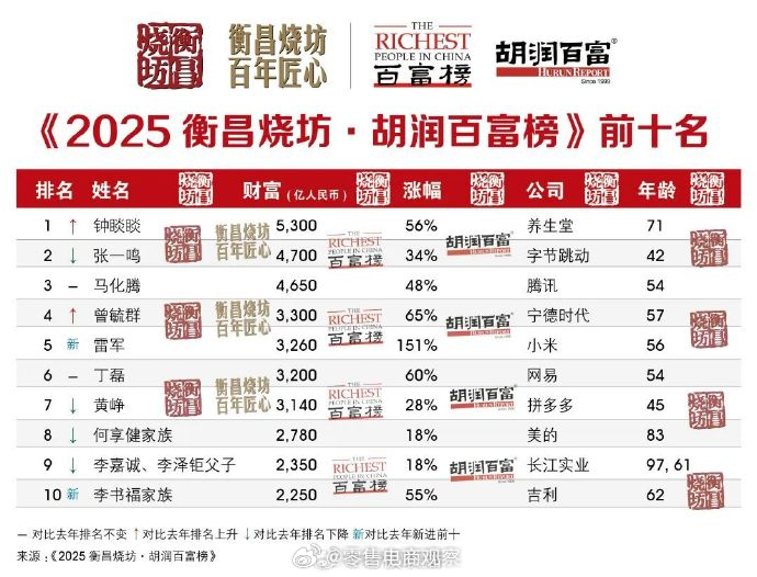 【雷军胡润百富榜排名第5雷军身价3260亿】10月28日,2025胡润百富榜出炉。56岁的雷军财富比去年增长1960亿元(+151%),成为今年上榜企业家中财富增长数额最高的企业家,以3260亿元排名第五,上升14位,这是他自2015年后时隔十年第二次闯进前五。今年上半年,小米营收2272亿元,同比增38%;净利润215亿元,同比增70%。汽车业务成增长引擎,上半年交付15.72万辆,居汽车新势力前五,收入213亿元。IoT物联网业务收入710 亿元,同比增51%,毛利超手机成利润主力。智能手机收入961亿元,全球市占率14.7%,居第三,但第二季度收入微降。今年小米共有10人上榜。钟睒睒又登顶中国首富