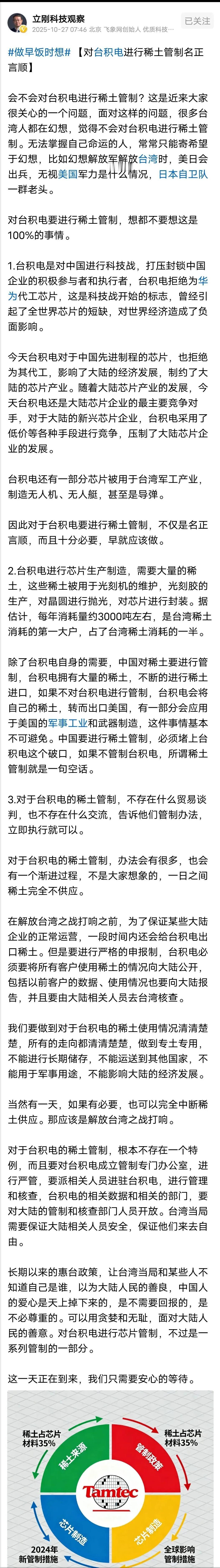 项立刚谈到必须对台积电实施稀土管制。若不加以管制,台积电极有可能成为向美国输送稀土的超级中转站,目前台积电完全倒向了美国,对大陆芯片发展毫无助力,很多先进芯片都不帮大陆代工,也没必要对台积电客气。 2025年10月,台积电亚利桑那工厂量产进入倒计时阶段,该工厂独家代工美国顶级AI芯片,却明确拒绝承接大陆先进制程订单。 稀土作为芯片制造的核心原料,大陆在稀土提纯领域拥有技术优势,若放任台积电成为稀土中转输美通道,将导致大陆丧失战略主动权,因此实施管制具有充分的现实依据。 2025年10月台积电最新财报显示,其对美代工营收占比已攀升至68%,英伟达H200、谷歌TPU v6等支撑美国AI产业优势的顶级芯片,均由台积电独家代工。 更值得关注的是,台积电对大陆设定明确限制:7纳米以下先进制程订单一律拒绝承接,即便为民用手机芯片的相关订单也直接驳回,此举已超出单纯商业选择范畴,实质上是明确的立场站队。 部分观点认为"稀土管制"举措过激,实则是对稀土在芯片制造中的核心作用认知不足。具体而言,芯片中的镝元素可增强抗干扰能力,保障芯片在复杂电磁环境下的稳定运行;铽则是光刻环节的关键材料,缺乏铽将无法实现先进制程电路的刻蚀。 中国稀土行业协会2025年数据显示,全球92%的高纯稀土分离技术由我国掌握,而美国本土提纯产能不足5%,这一技术与产能优势构成了管制举措的核心底气。 台积电存在成为"稀土中转站"的风险,已有实际案例可佐证。2024年,台积电高雄工厂发生一起异常事件:一批用于芯片制造的镨钕合金去向存疑,经海关总署调查核实,该批稀土最终流入美国雷神公司,直接应用于导弹制导芯片生产。 随着亚利桑那工厂即将投产,其完全可能将稀土混入"代工耗材"中输美,这种方式比直接出口更具隐蔽性,因此从源头实施管控势在必行。 以资源管制作为博弈筹码,历史上已有成功先例。上世纪80年代,日本半导体产业发展迅猛,在全球存储芯片市场的占比高达80%,对美国产业安全构成直接威胁。 美国随即对日本实施稀土管制,切断其芯片制造的原料供应,仅五年时间,日本存储芯片市场占比便降至不足10%,丧失产业竞争力。 当前局势已然逆转,2025年美国商务部最新报告明确指出:"若失去中国稀土供应,美国高端芯片产能将骤降70%",这一数据印证了稀土管控的现实威慑力。 针对"台积电能否寻求其他稀土供应渠道"的疑问,答案是否定的。澳大利亚虽拥有丰富稀土矿资源,但矿石纯度较低,提纯1吨高纯稀土需消耗数十吨矿石,导致生产成本极高;缅甸此前通过非正规渠道出口部分稀土,但2025年上半年我国强化监管后,其对华稀土出口量暴跌91%,供应基本中断。 更为关键的是提纯技术壁垒,美国企业耗时10年、投入上百亿美元,至今未能复制我国的提纯工艺,技术优势的垄断性难以突破。 台积电的"双重标准"进一步凸显了管制的必要性。一方面,其获取大陆市场收益——2025年大陆市场为台积电贡献22%的营收,主要来自成熟制程的汽车芯片、家电芯片订单;另一方面,却将核心先进产能全部投向美国,甚至将部分从大陆市场获得的利润用于补贴亚利桑那工厂建设。 这种"获取大陆市场收益的同时损害大陆产业利益"的行为,在全球大型企业中较为罕见。此前我国出于产业链稳定考量保持克制,当前台积电立场已明确倾向美国,继续妥协将损害战略利益。 该芯片制造所需的钬元素,全球95%的高纯供应量来自我国。实施管制后,台积电将无法代工此类芯片,美国导弹产能将出现显著下滑。且管制可精准聚焦军事芯片领域,不影响民用领域供应,实现精准打击效果。 关于"管制是否会引发芯片战升级"的担忧,我国已制定完善预案。近年来,大陆持续推进"稀土+芯片"双自主战略,中芯国际14纳米制程已实现稳定量产,虽与台积电先进制程存在差距,但可满足多数民用需求。 同时,管制将采取差异化策略,针对先进制程所需稀土元素实施精准管控,成熟制程所需稀土正常供应,既能有效遏制对手,又能保障自身产业链稳定。 我国早期通过稀土出口获取外汇,如今凭借稀土技术优势掌握战略主动权,这是产业升级的必然结果。若台积电希望持续参与两岸市场竞争,需展现足够诚意,而非在获取大陆利益的同时倒向美国。 实施稀土管制并非以搞垮台积电为目标,而是促使其认清战略现实:在大国博弈格局中,试图"骑墙观望"实现双重获利的模式难以持续。 该举措的实施,既能遏制美国高端芯片与军事芯片产能,又能推动台积电重新审视两岸合作关系,为大陆芯片产业发展拓展空间。在战略利益博弈中,妥协无法换取尊重,唯有掌握主动权,才能在大国竞争中占据有利地位。 各位读者你们怎么看?欢迎在评论区讨论。