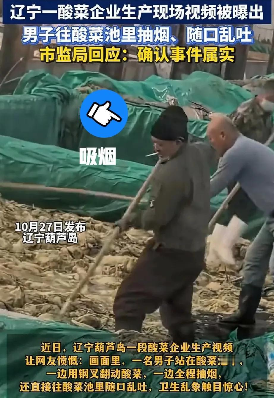 辽宁兴城“老痰”酸菜,“足”时发酵,“烟”制而成,畅销全国。 某酸菜企业,工作人员在酸菜池里抽烟吐痰。监督管理局已将该批次酸菜全部扣押并销毁。 又是一个人干掉了东北酸菜。 这个人就是坏,自己家的酸菜缸他能吐痰吗? 不说哪家企业,看上去是保护了企业,其实是害了当地所有的酸菜企业,以后葫芦岛出来的酸菜估计就滞销了。 感谢网友,以后就告别酸菜了,想吃自己腌。