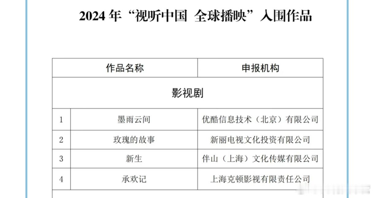 广电总局公布2024年“视听中国全球播映”评选结果刘亦菲《玫瑰的故事》是入围作