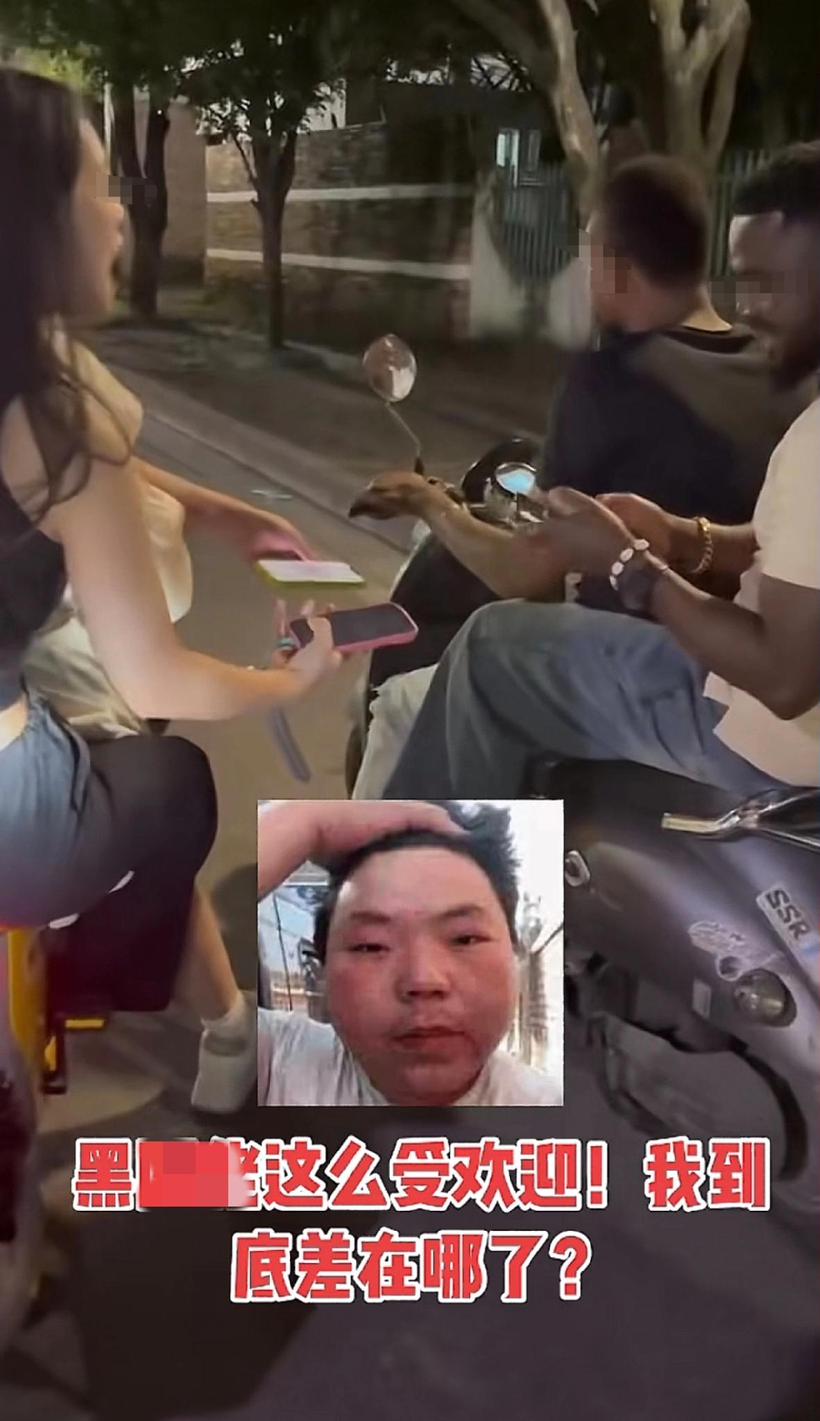 没想到,黑人小哥在国内这么受欢迎。不知道是在哪个省份。两个黑人小哥骑着电驴,路上一国内女子和闺蜜骑着电驴在后面追。刚开始还以为是黑人小哥做了啥事惹到这俩女生来。追上后,俩女生嘴里不知道咕噜咕噜的说着什么英语。然后俩人就掏出了手机,笑得很欢,让俩小哥加微信[笑哭]。 搞了半天还以为啥事,原来是来搭讪的,想要学英语。