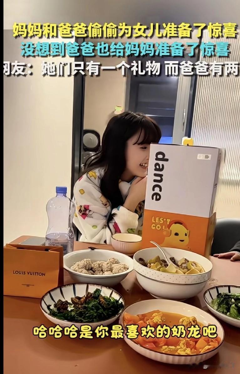 咱就说这家人的惊喜也太会玩了吧!爸妈偷偷给女儿准备惊喜,结果爸爸还给妈妈也安排上了,这波操作绝了~ 女儿看到奶龙礼物眼睛都亮了,正开心着呢,一转头发现妈妈那边还有个LV,原来爸爸是双份惊喜选手啊!网友们都笑疯了:“她们只有一个礼物,爸爸直接俩,这家庭地位一目了然~” 一家人围坐在一起,满桌的家常菜看着就温馨,这波双向惊喜把爱意拉满了!咱就喜欢看这种充满烟火气又暖心的家庭日常,果然幸福就是藏在这些小惊喜和家常菜里呀~