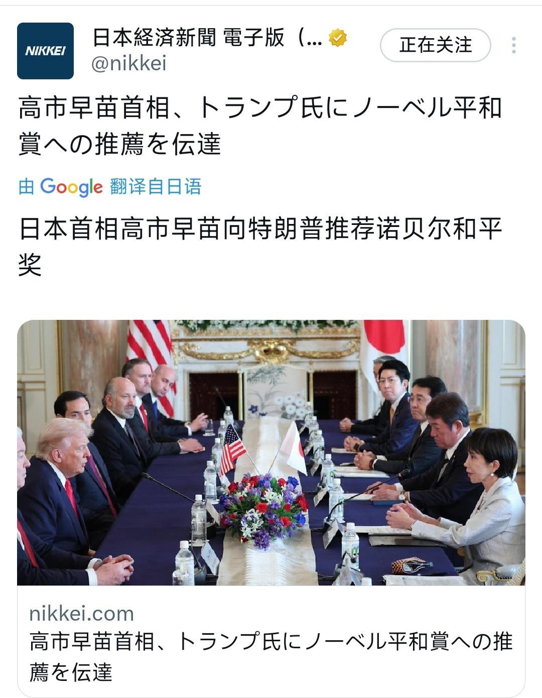 日本首相高市早苗今天(10月28日)提名特朗普诺贝尔和平奖。 [机智]评几句:精准迎合了特朗普的喜好。特朗普一把年纪了,但是就好这个虚名。所以这已经成为了各国招待特朗普的例行开胃菜。不过,今年的诺贝尔和平奖才过去没多久,这就开始备战下一届了?看起来,特朗普是最早备战下一届诺奖的参选人。