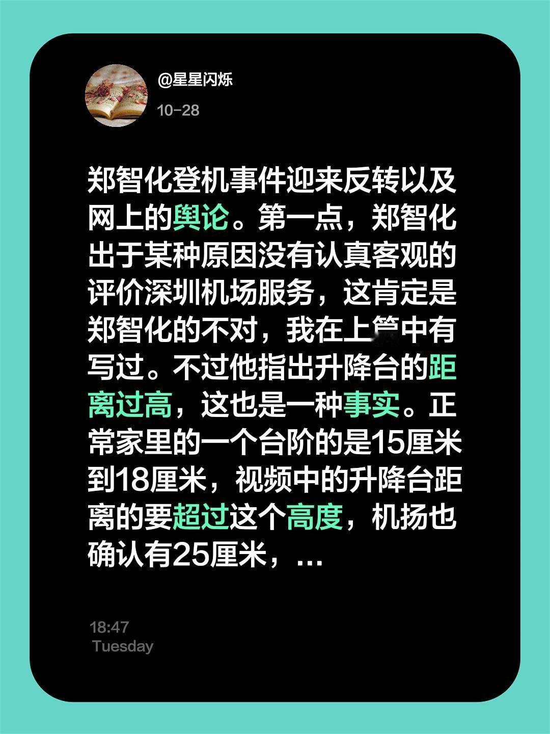 我评论了@环视频 的作品: 郑智化登机事件迎来反转以及网上的舆论。第一点,郑智化出于某种原因没有认真客观的评价深圳机场服务,这肯定是郑智化的不对。他指出升降台的距离过高,这也是一种事实。正常家里的一个台阶的是15厘米到18厘米,视频中的升降台距离的要超过这个高度,机扬也确认有25厘米,很明显是对残障人士不怎么友好的。我们知道,无论是景区还是机场,一些残障人士通道,它其实是正常人设计的,不是残障人设计的,所以在考虑方面会有不周到地方,这点是国内一些景区还有机场都需要改进的地方。现在还有一些网友翻出了郑智化以前经典歌曲的问题,说了一些比较难听的话。其实这不是郑智化一个人的问题,是那个时代的问题,当时许多港台成名歌手都有模仿或借鉴日本曲子的例子,包括当时的歌曲天王歌曲天后他们都有,你用今天30年后的视角去攻击30年前,这多少有点不合适。今天一些年轻的小有名气的歌手都会借鉴以前成名的曲风。事情一码归一码,不要复杂化。郑智化 郑智化水手 残疾人
