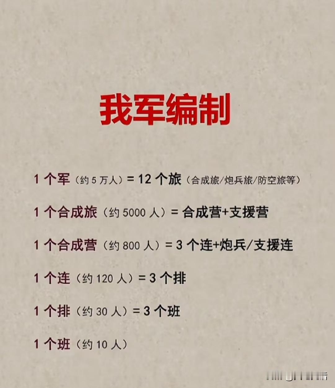 解放军最新部队战斗编制 全国五大战区。 战区下辖13个集团军。 集团军,辖12个合成旅,约5万人。 合成旅,辖9 个合成营长,约5000人。 合成营,辖3个步兵连,坦克,炮兵、支援、后勤等连,约800人。 一个连,辖3个排,约120人。 一个排,辖3个班,约30人。 一个班,约10人。