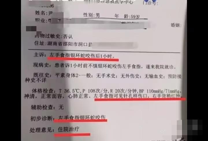 再贵难道比生命更贵? 网红被毒蛇咬伤,嫌血清太贵自行离开后失联! 10月26日晚,湖南洞口县网红尹无才被银环蛇咬伤,随后前往医院注射血清。但因嫌费用过高,未完成治疗便自行离开医院,之后失去联系。28日上午,记者从知情人士处了解到,目前该男子尚未找到,警方已经通知了他的家人,各方仍在寻找。 据悉,这名网红本名叫尹华健,是一名59岁男子。10月26日晚,他在社交平台直播挖蛇时,突然被一条毒蛇咬伤,直播时他还曾拨打急救电话。根据医院就诊记录,他左手食指是被银环蛇咬伤,处理意见为住院治疗。因嫌医院血清太贵,尹华健直接驾驶一辆车牌号为湘E0068U的雪佛兰轿车离开。 当地警方、救援队及交警部门联合展开搜寻,通过调取监控发现尹华健于27日00:08晚驾车出城,随后不知所踪。 上述知情人士称,事发当晚,老尹用的是别人的账号直播。其介绍,老尹白天帮人卖桔子,晚上去抓蛇,挖蛇的主要目的就是直播,“几天前他还跟我说去挖蛇,我还说你挖什么蛇,迟早有一天被蛇咬,他还说不怕。” 尹华健所在村一位村干部表示,26日事发当晚就接到了老尹被蛇咬伤后下落不明的消息,他们组织了10多人帮忙寻找,但至今还没有任何消息。“他在医院检查都做了,之后从医院开车走了,我给他打电话一直关机,到现在都还是关机状态。”该村干部表示,尹华健的家人正从外地赶回。